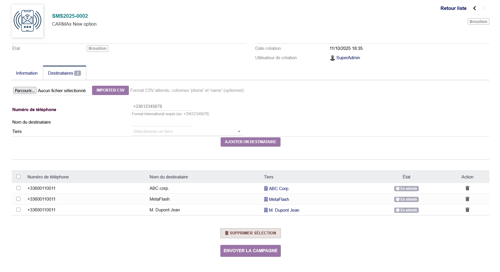 Important: SMS Campaign requires the DoliSMS module for SMS delivery. DoliSMS handles the technical aspects of sending (platform connection, delivery tracking, etc.), while SMS Campaign focuses on organizing recipients and managing campaigns.