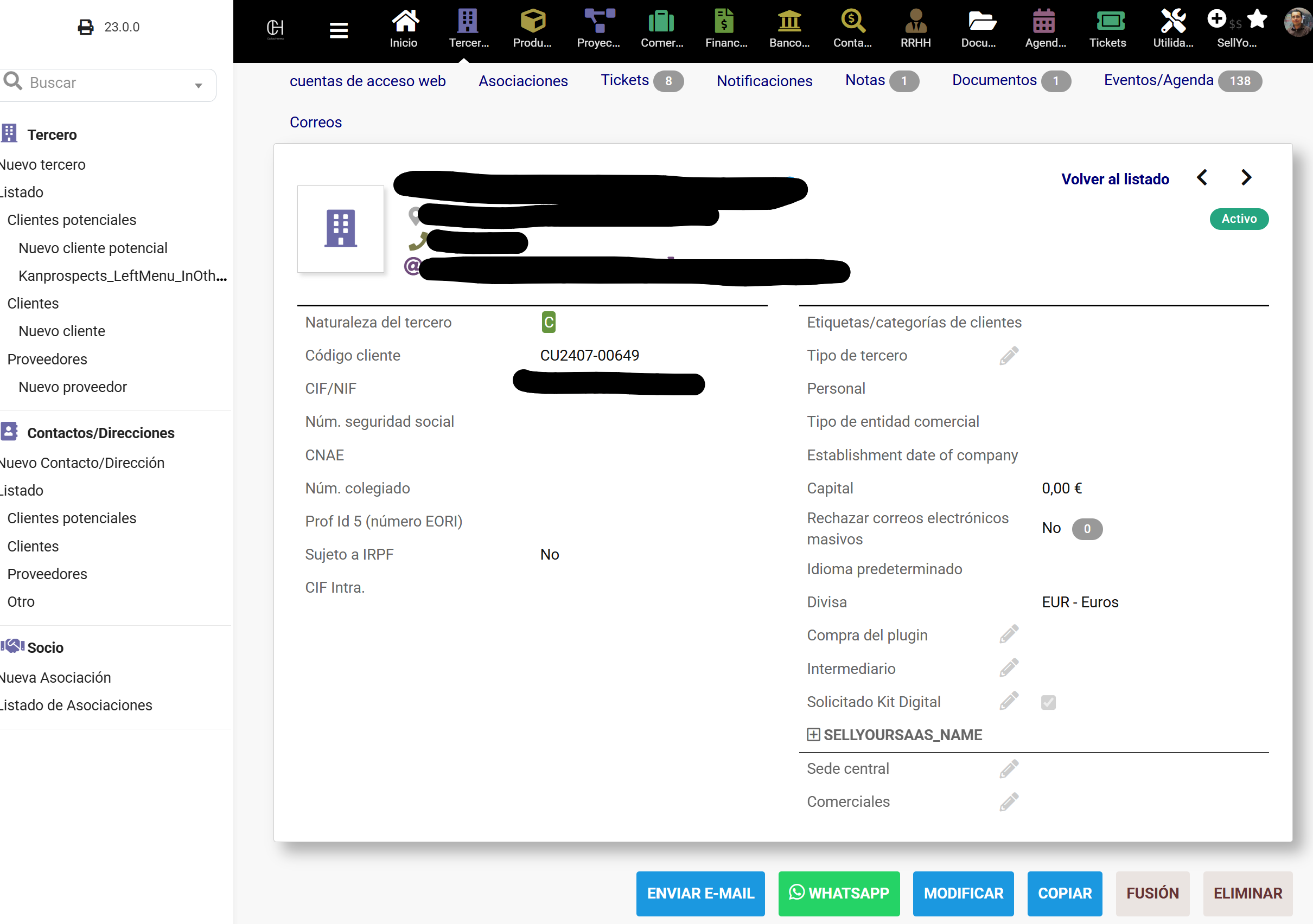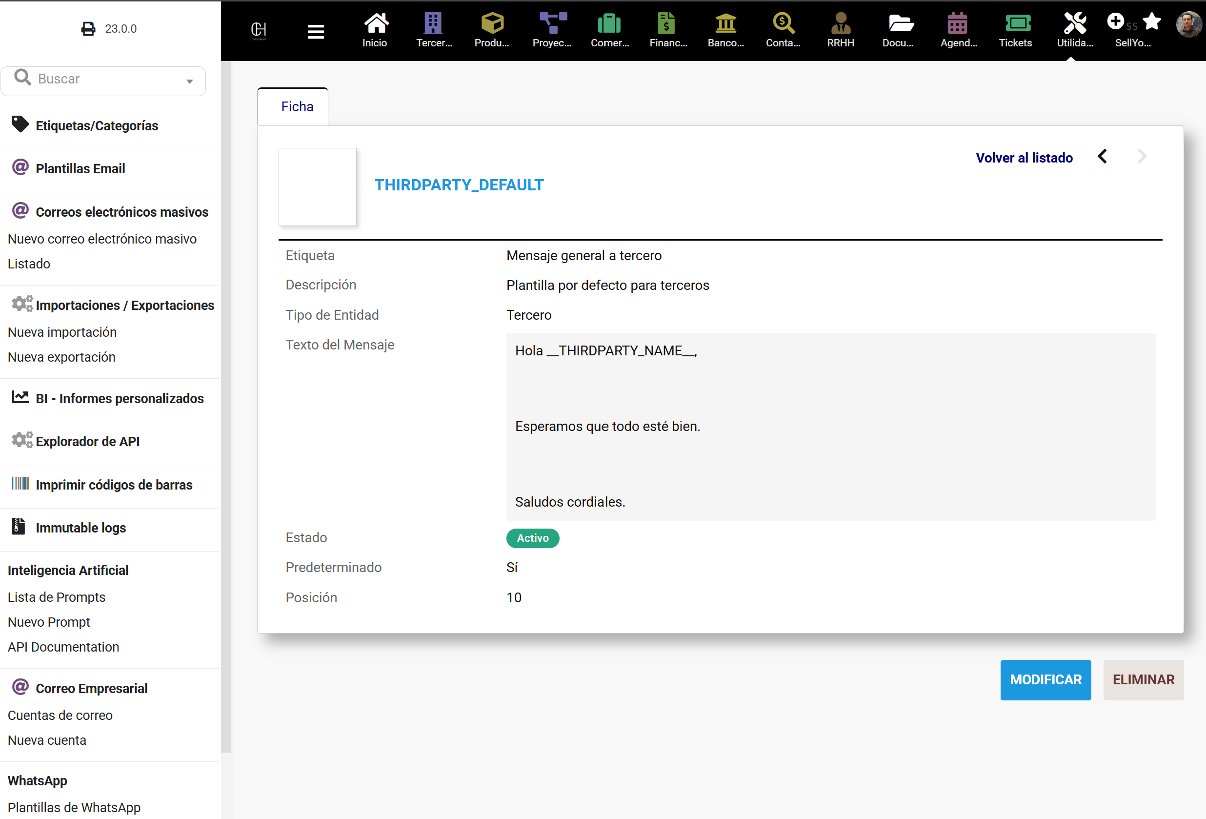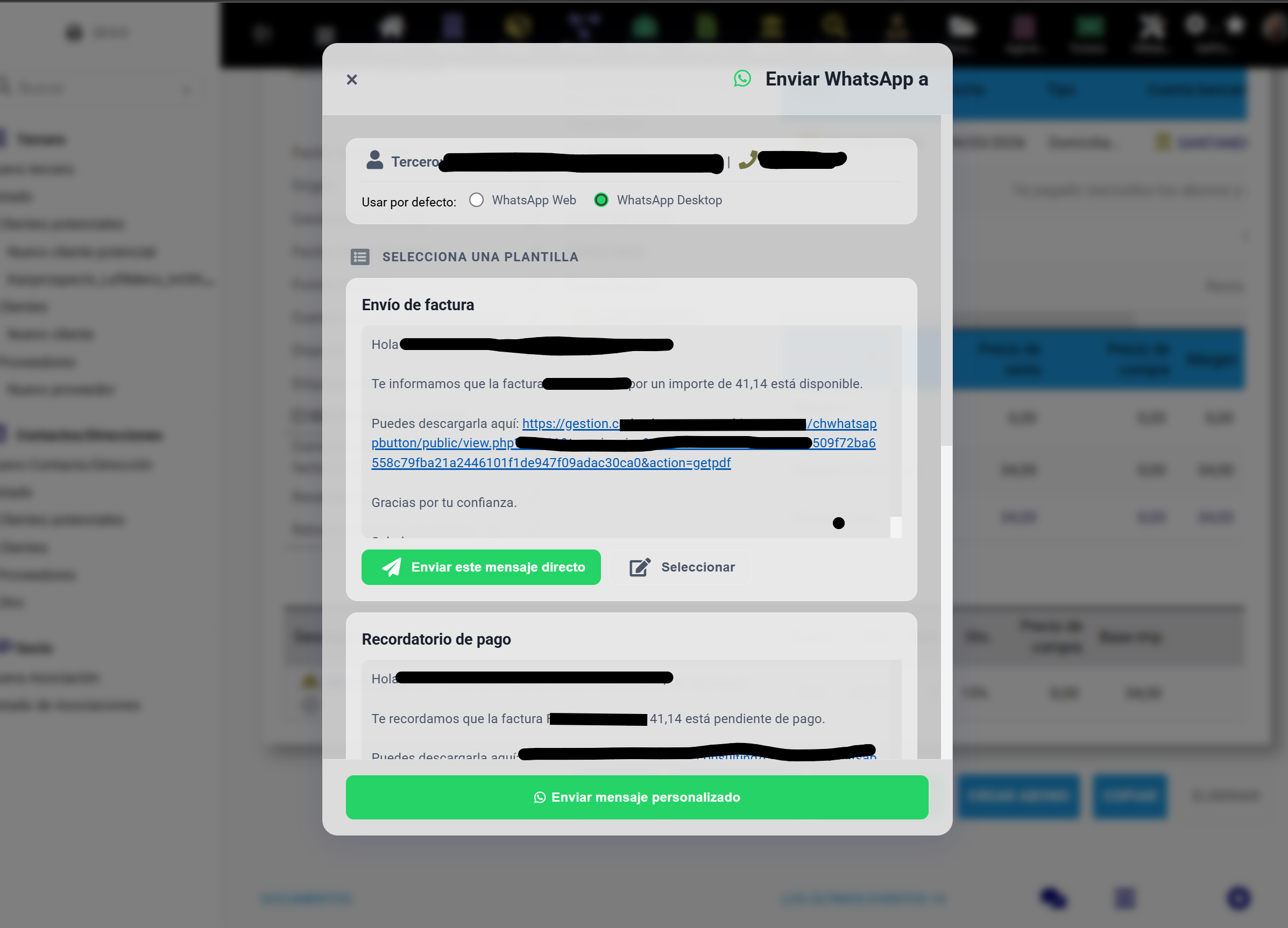 Ajoutez des boutons WhatsApp sur les fiches des tiers, projets, propositions et factures. Envoyez des messages directement depuis Dolibarr avec des modèles personnalisables et substitution automatique de variables.
