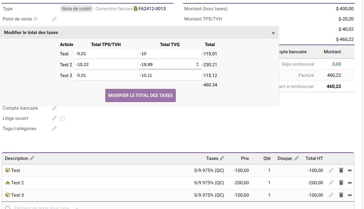 In some circumstances, a user need to modify the calcultated total of taxes to match calculated totals on legacy systems or manually. This module add function to modifiy calculated taxes on invoices lines. Works for customer and supplier invoices as well as credit notes.