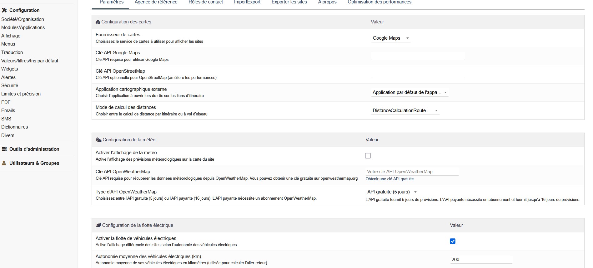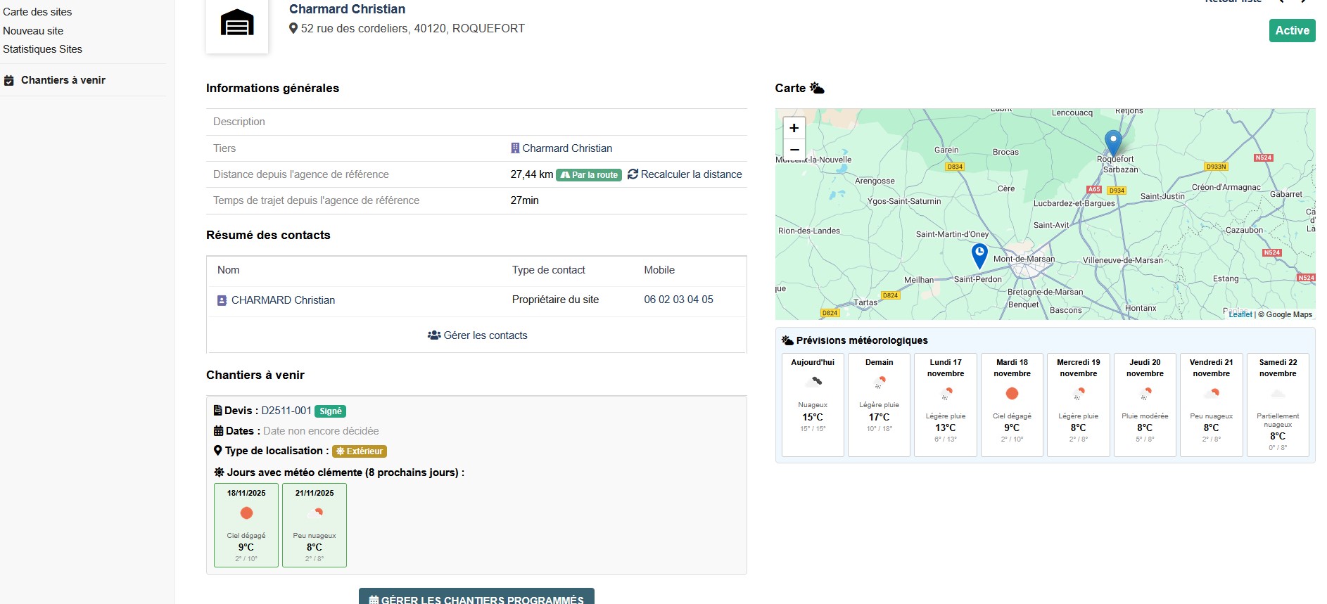 Gérez tous les emplacements physiques de vos clients et partenaires avec géolocalisation automatique. Calculez distances et temps de trajet, consultez les prévisions météo et planifiez vos chantiers. Visualisez vos sites sur une carte interactive et optimisez vos déplacements professionnels.