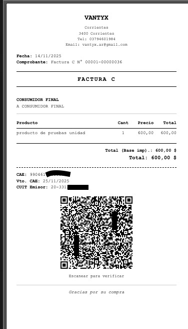 • Invoice types A/B/C, X receipts and custom tickets with automatic CAE + official QR.