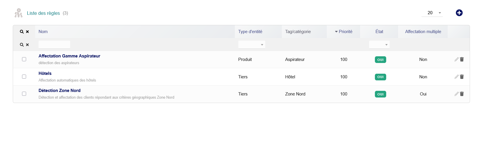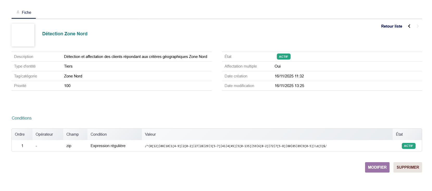Example for third parties: Automatic detection of the "Paris Region" via a regular expression on the postal code: ^(75|77|78|91|92|93|94|95) to classify all Parisian customers in a "Paris Region Clients" category for example.