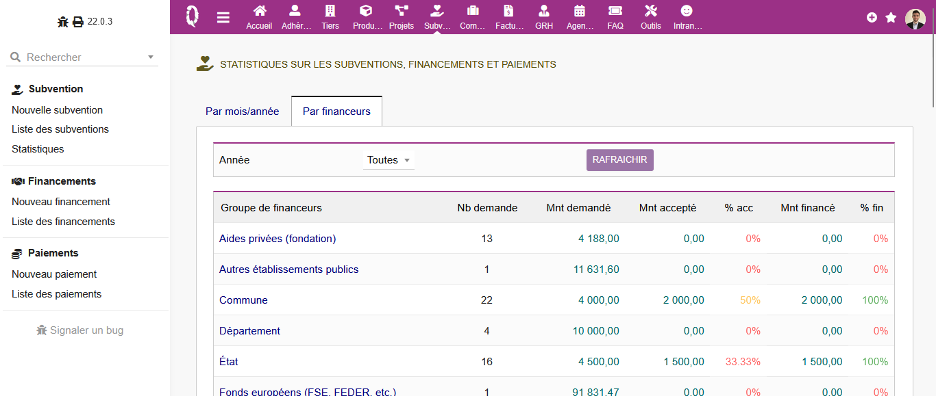 Tracking of grants, funding requests, funders, and payments Ability to add documents: request, notification, agreement, report, etc. Tracking of various statuses: draft, submitted, accepted, refused, funded, report submitted Statistics by year, funders, and funder groups