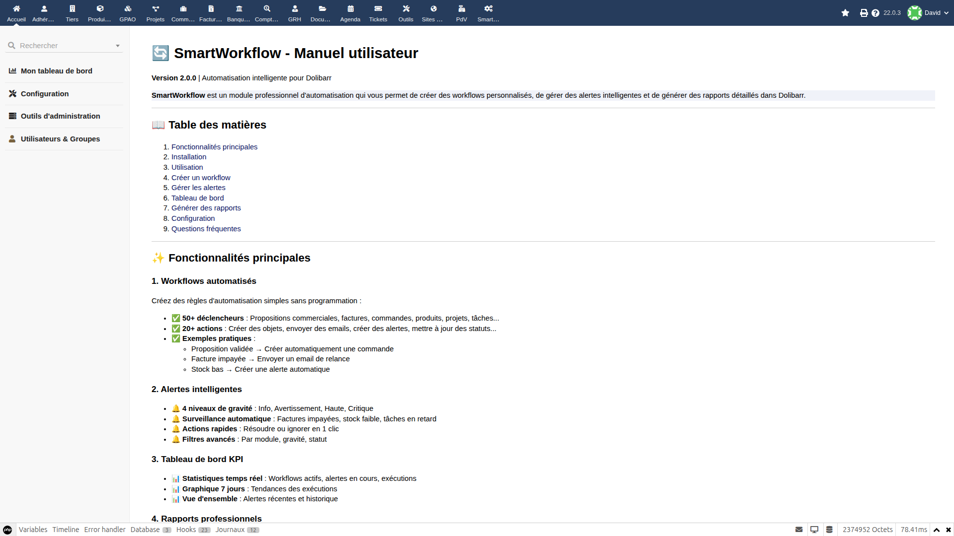 SmartWorkflow is the professional automation solution for Dolibarr. Create custom workflows, manage intelligent alerts and generate detailed reports, all without writing a single line of code.