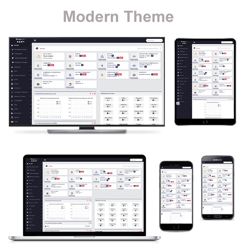 The new Theme ModernTheme, endowed with Responsive display, allows you to change the style of your Dolibarr completely, it is suitable for all computer devices of different sizes: PC desktop, Laptop, Smartphone, tablet ...