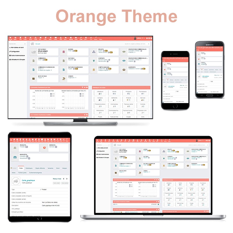 The new Theme "OrangeTheme", endowed with Responsive display, allows you to change the style of your Dolibarr completely, it is suitable for all computer devices of different sizes: PC desktop, Laptop, Smartphone, tablet ...