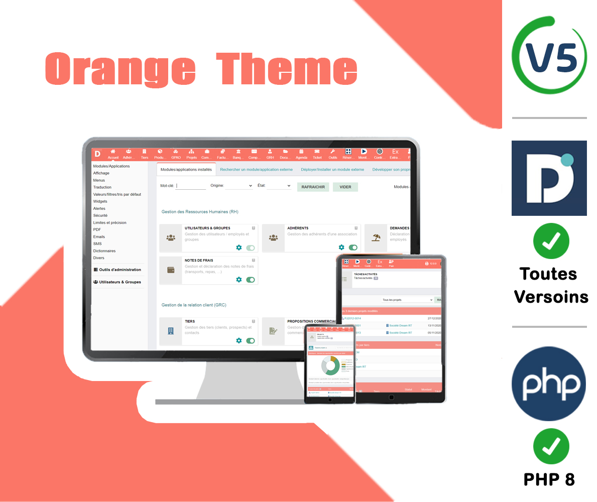 Il nuovo tema "OrangeTheme", dotato di display Responsive, ti permette di cambiare completamente lo stile del tuo Dolibarr, è adatto a tutti i dispositivi informatici di diverse dimensioni: PC desktop, Laptop, Smartphone, tablet ...