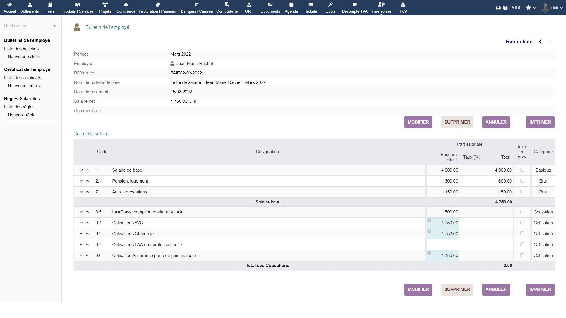 DOLIBARR LOHNABRECHNUNG SCHWEIZ: Generieren Sie Ihre Schweizer Lohnabrechnung auf Dolibarr, - Geben Sie die in Ihrem Land geltenden Tarife ein, - Berechnen Sie den zu versteuernden Nettolohn und den zu zahlenden Nettolohn. - Generieren Sie Ihre Gehaltsabrechnung auf Dolibarr im PDF-Format.