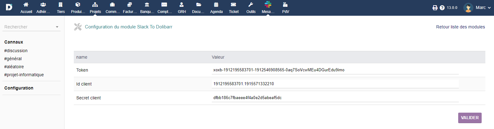 Einfache Konfiguration über die Dolibarr-Oberfläche: Geben Sie Ihren Slack-Token, Ihre Client ID und Ihr Client Secret ein, um Ihren Workspace mit Dolibarr zu verknüpfen.