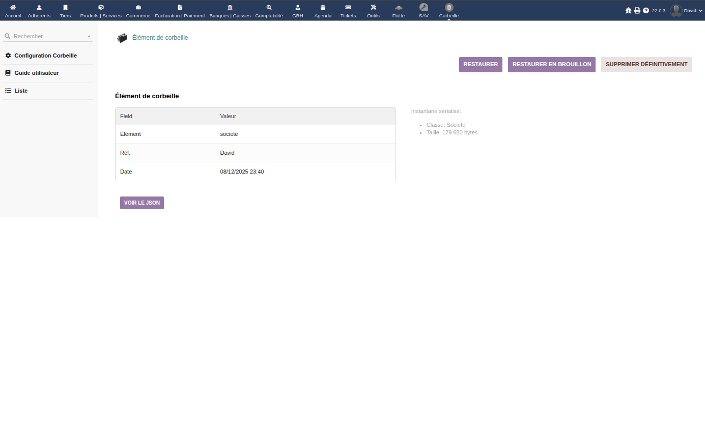 Gestiona elementos eliminados en Dolibarr: restaura, elimina de forma permanente y registra con seguridad.