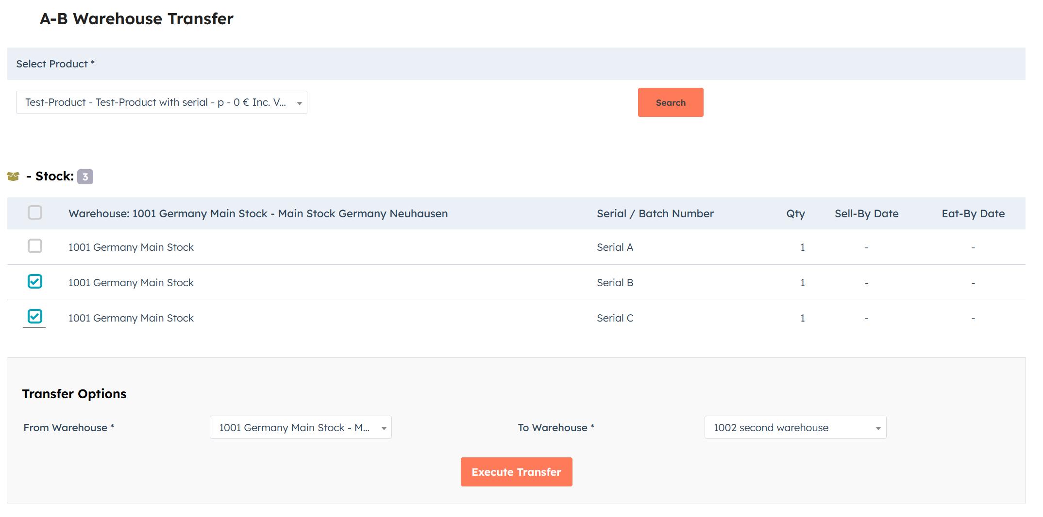 3. Check boxes for 5 specific serial numbers in Main Warehouse