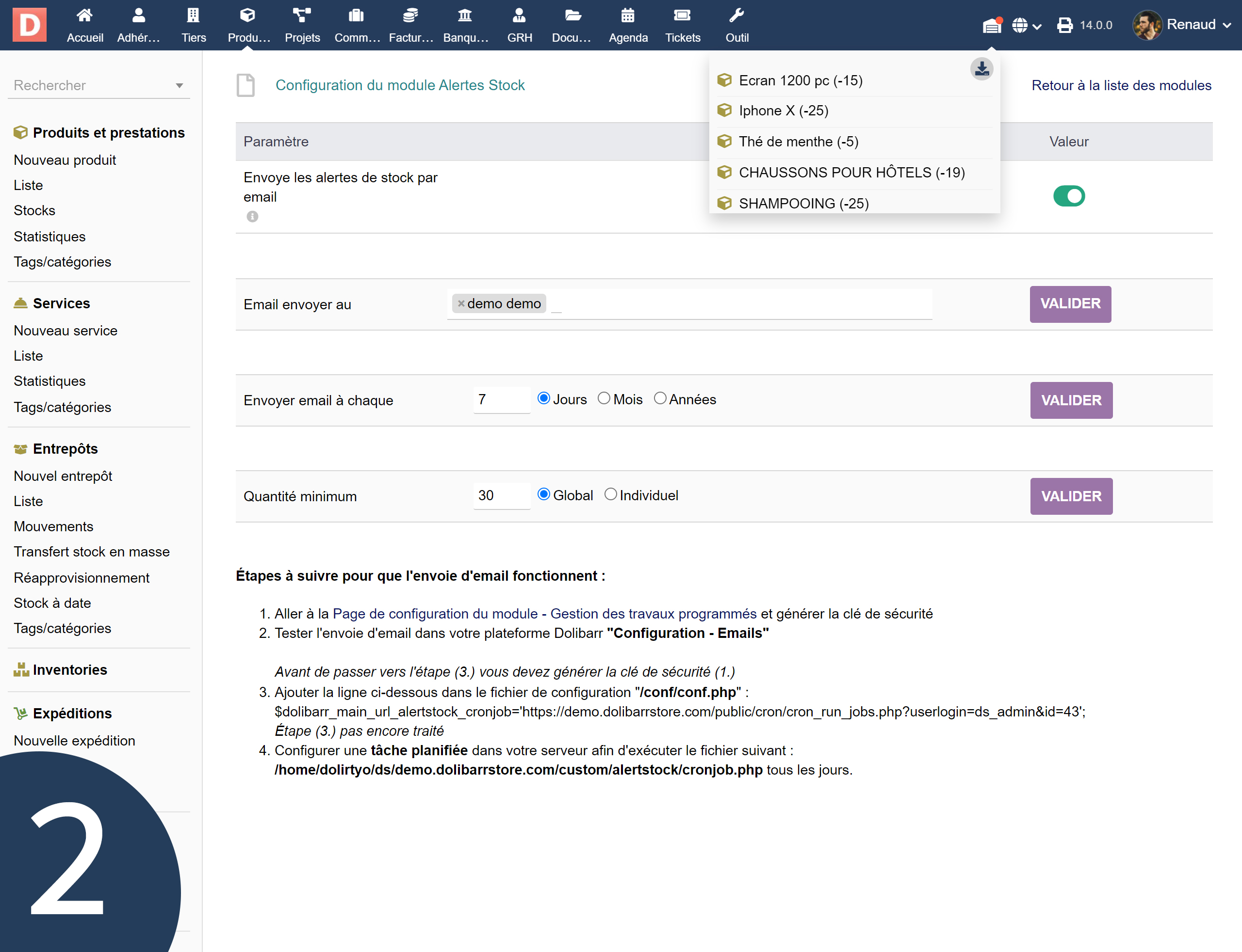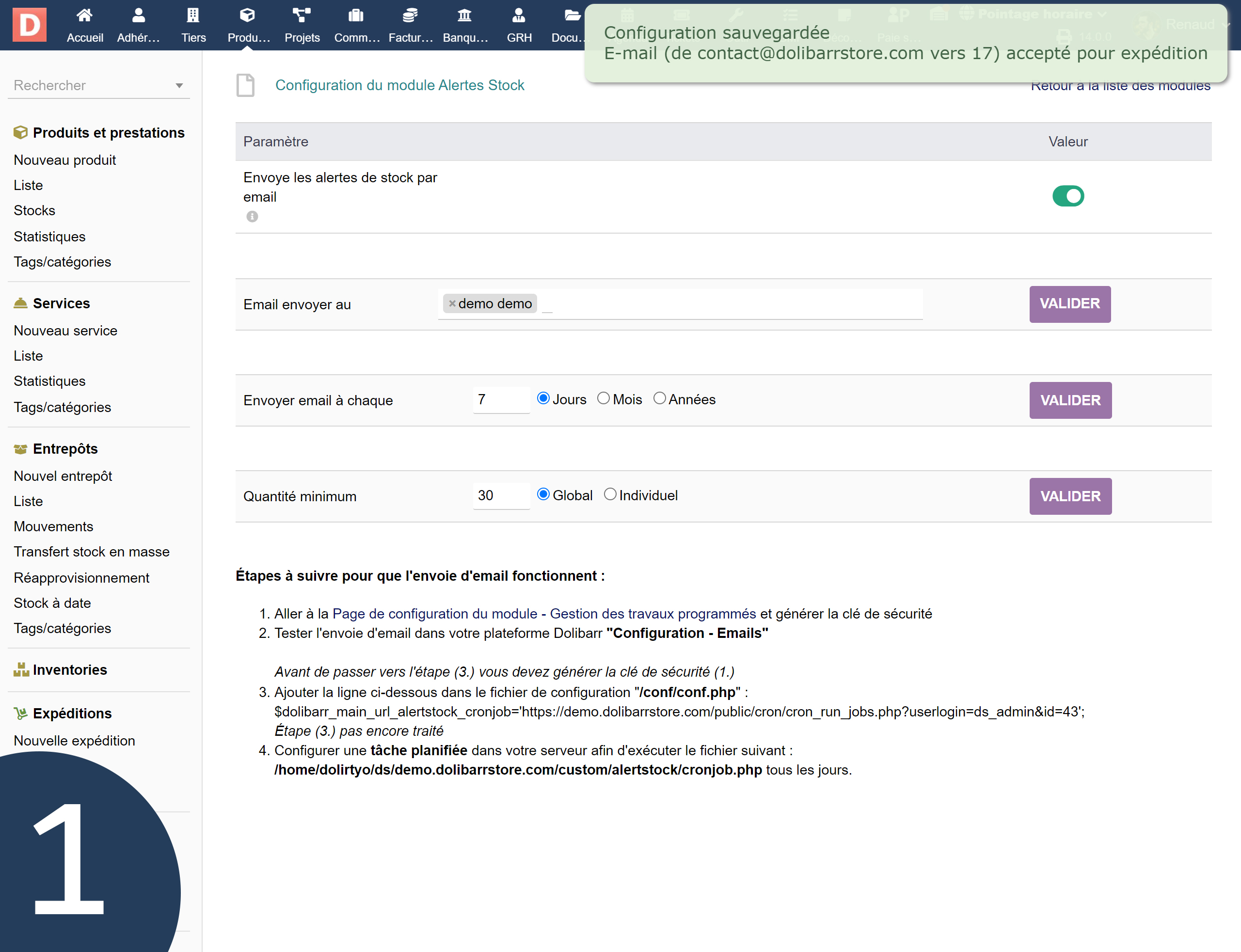 Product Low Stock Alert is useful to give the Dolibarr user update of product's on hand quantity or forecast quantity via mail.