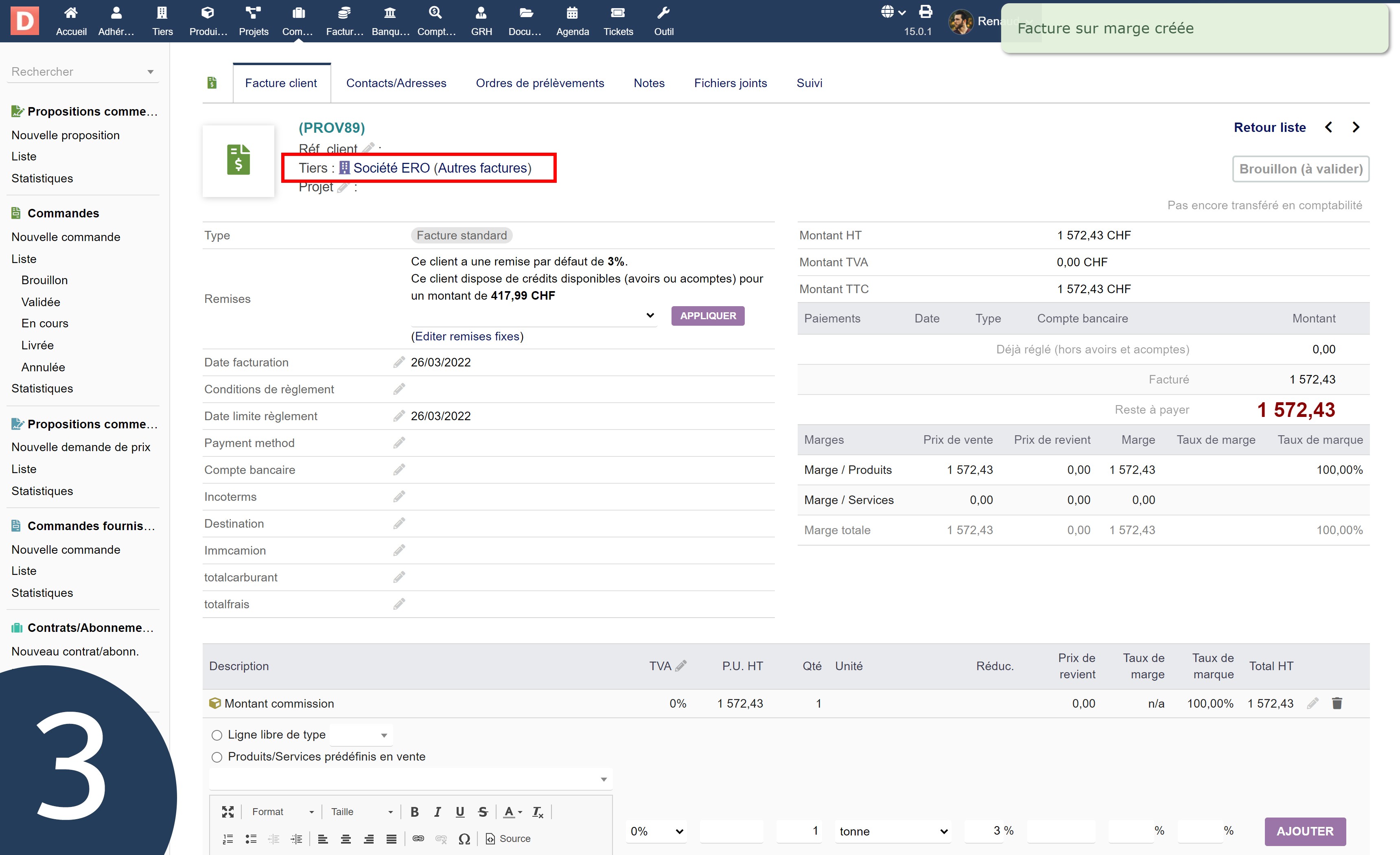 El módulo “Facturation sur marge” (Facturación sobre margen) para Dolibarr permite transformar con un solo clic el margen obtenido en un pedido de cliente en una factura dedicada (comisión, retrocesión, remuneración de agente, etc.), ideal para empresas de intermediación, corretaje o subcontratación comercial.