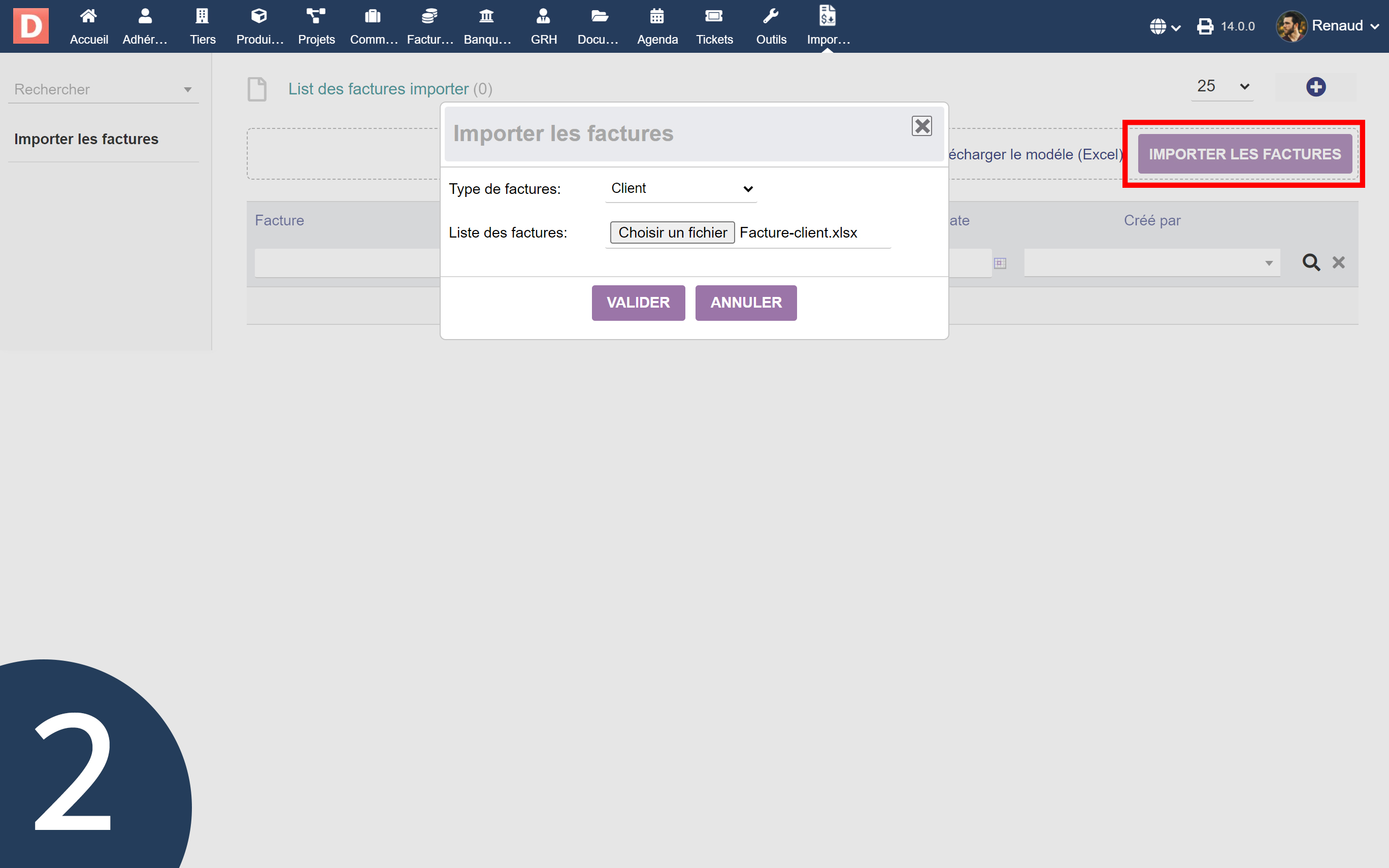 The module adds a dedicated “Import invoices” screen in Dolibarr, with a process in two main steps: