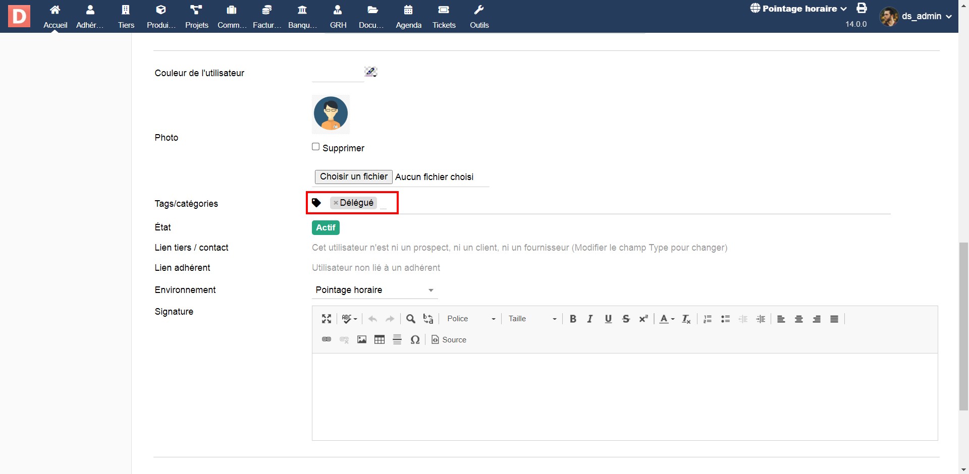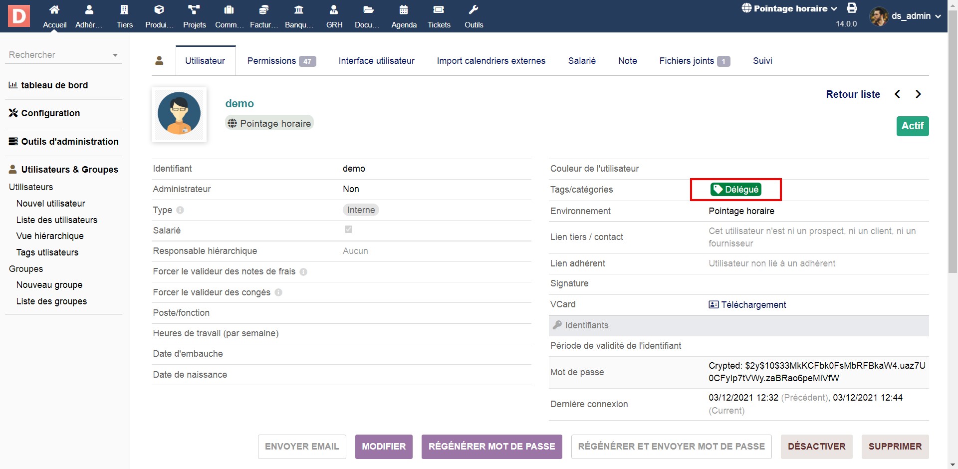 Les utilisateurs délégués sont identifiés grâce à un tag/catégorie (ex. : “Délégué”) ajouté dans leur fiche utilisateur.