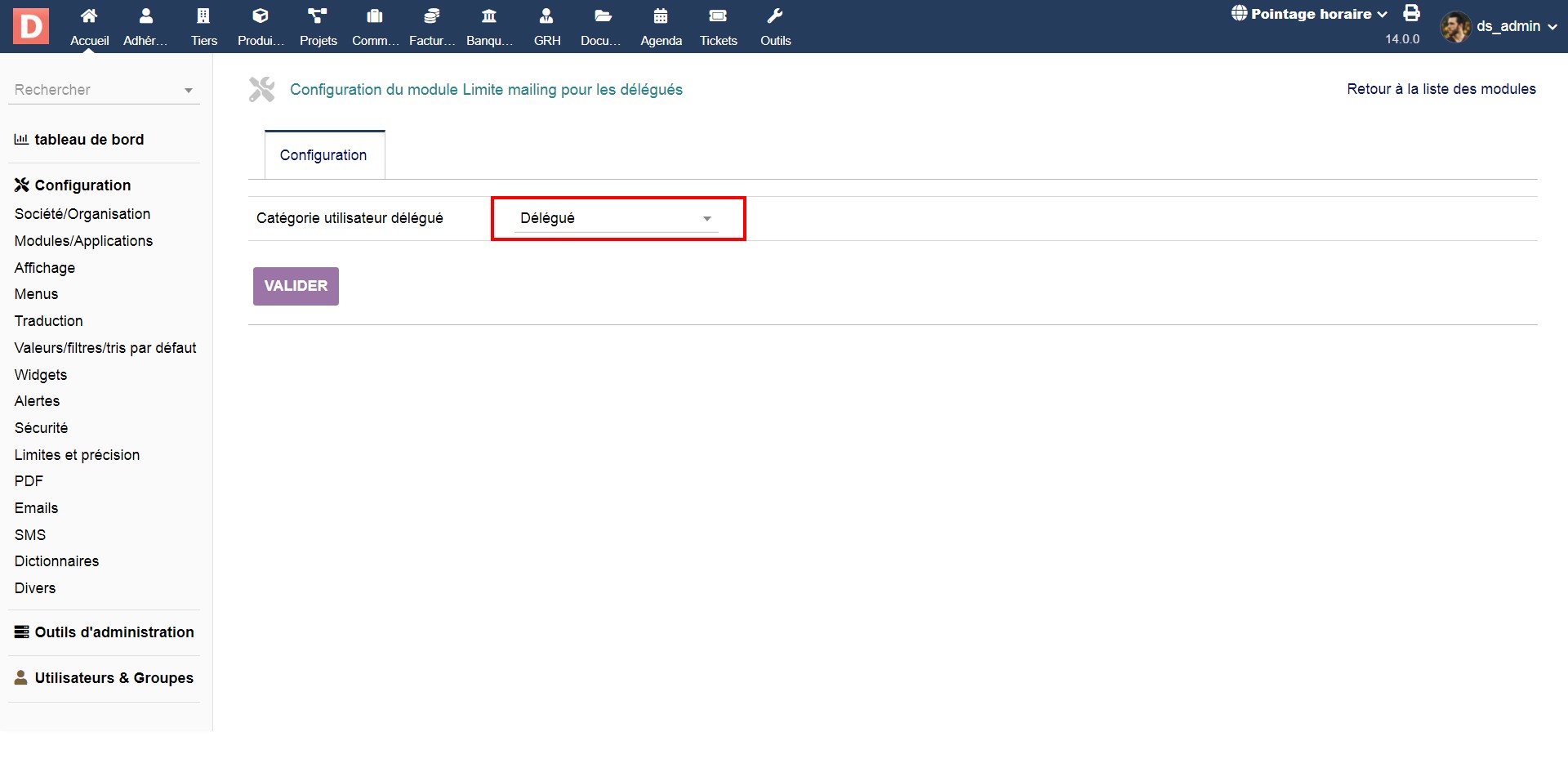 Dans la configuration du module, l’administrateur choisit la catégorie représentant les délégués.