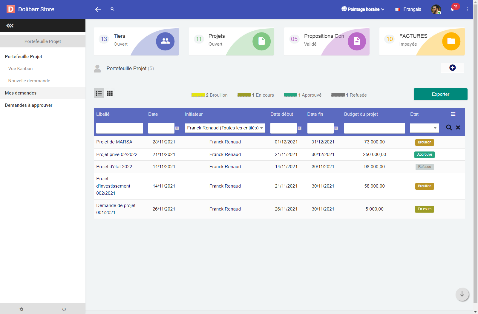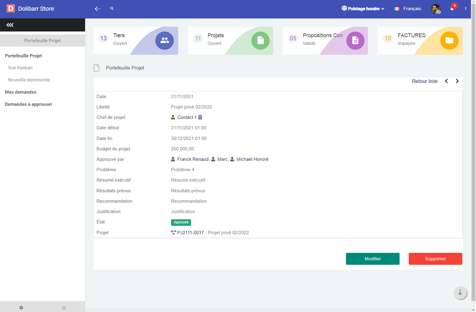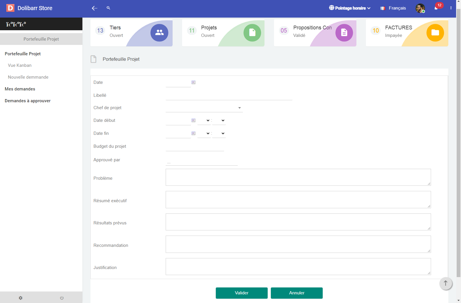 The Project Portfolio module adds a dedicated space in Dolibarr for managing, tracking, and approving projects within the organization. It provides a global view of all project requests, their progress, budgets, and the users involved. This module is particularly suited for companies that want to centralize their internal or external project management in a modern and intuitive interface.