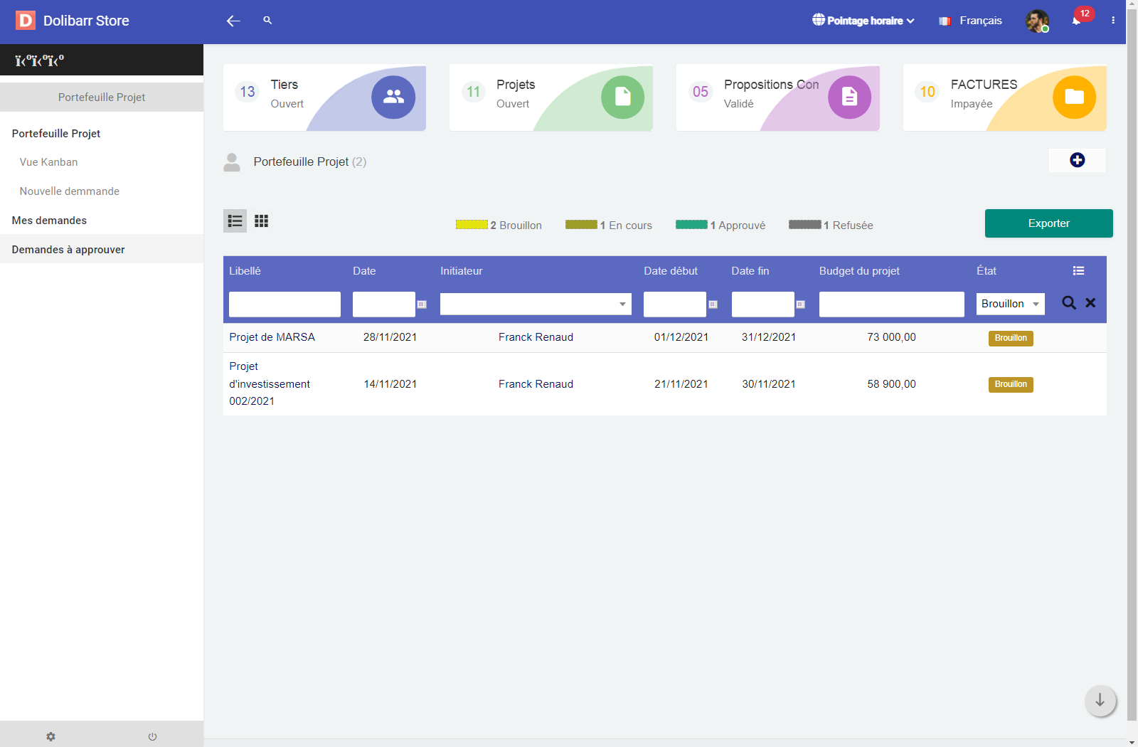 The Project Portfolio module adds a dedicated space in Dolibarr for managing, tracking, and approving projects within the organization. It provides a global view of all project requests, their progress, budgets, and the users involved.