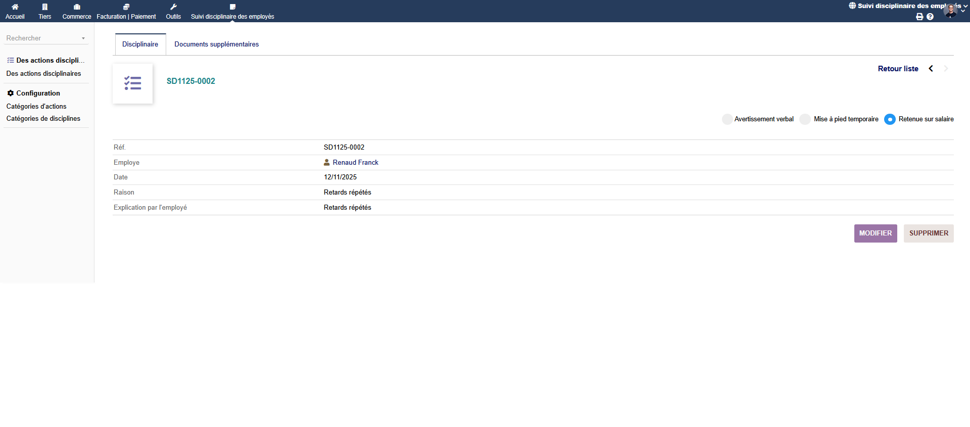 El módulo Seguimiento disciplinario de los empleados permite a las empresas gestionar de manera eficiente todas las acciones disciplinarias aplicadas a sus empleados. Centraliza las sanciones, los motivos, los documentos asociados y el historial completo de cada empleado.