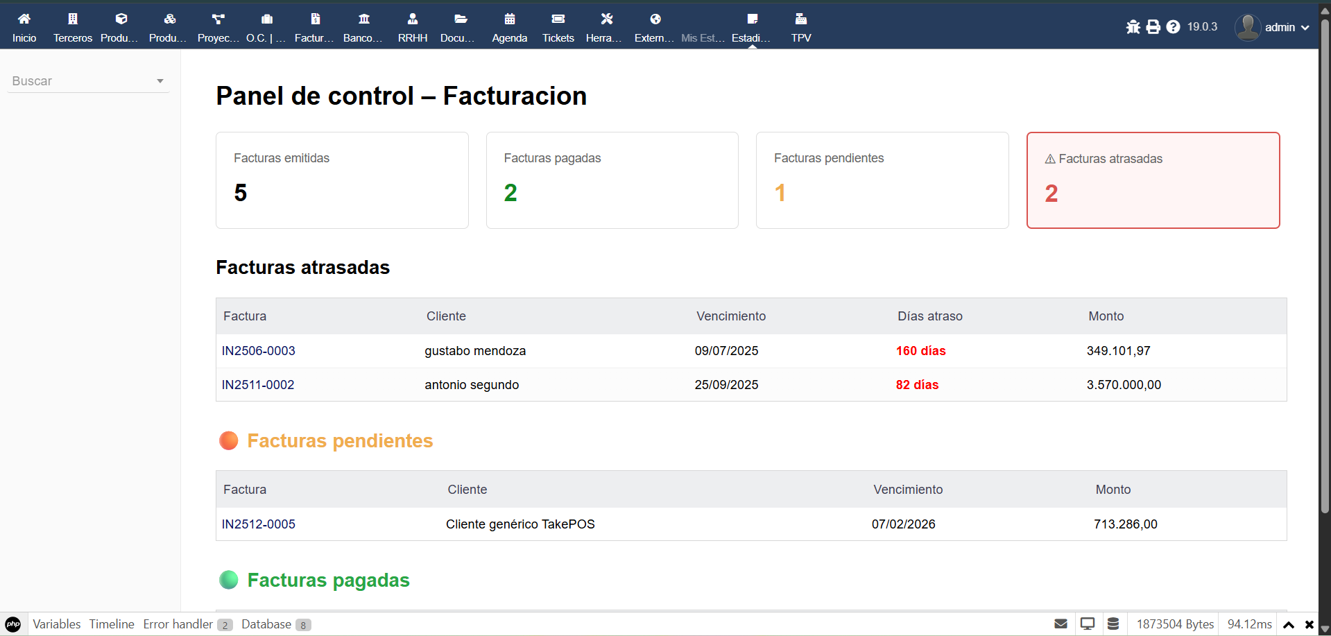 including overdue invoices with delay in days, pending invoices and paid invoices.