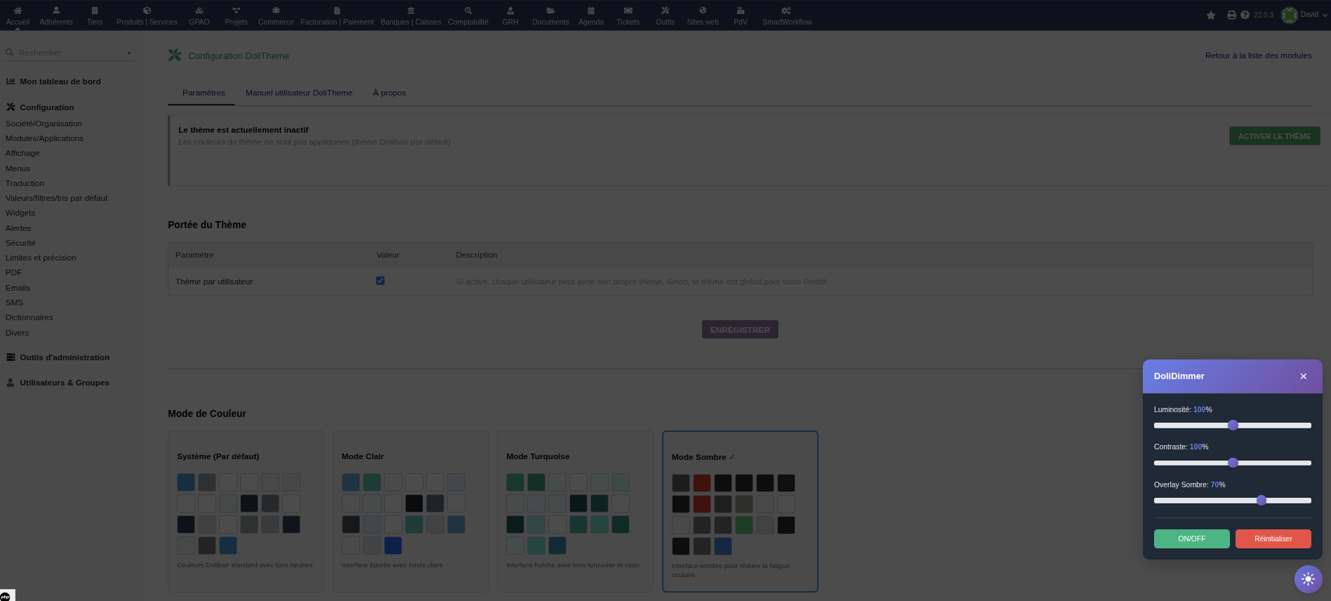 DoliDimmer – Controllo luminosità e contrasto per Dolibarr. Modulo che permette di regolare in tempo reale la luminosità, il contrasto e l'opacità dell'interfaccia Dolibarr per una migliore leggibilità e comfort visivo ottimale secondo le tue preferenze.