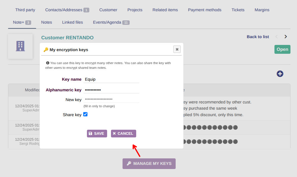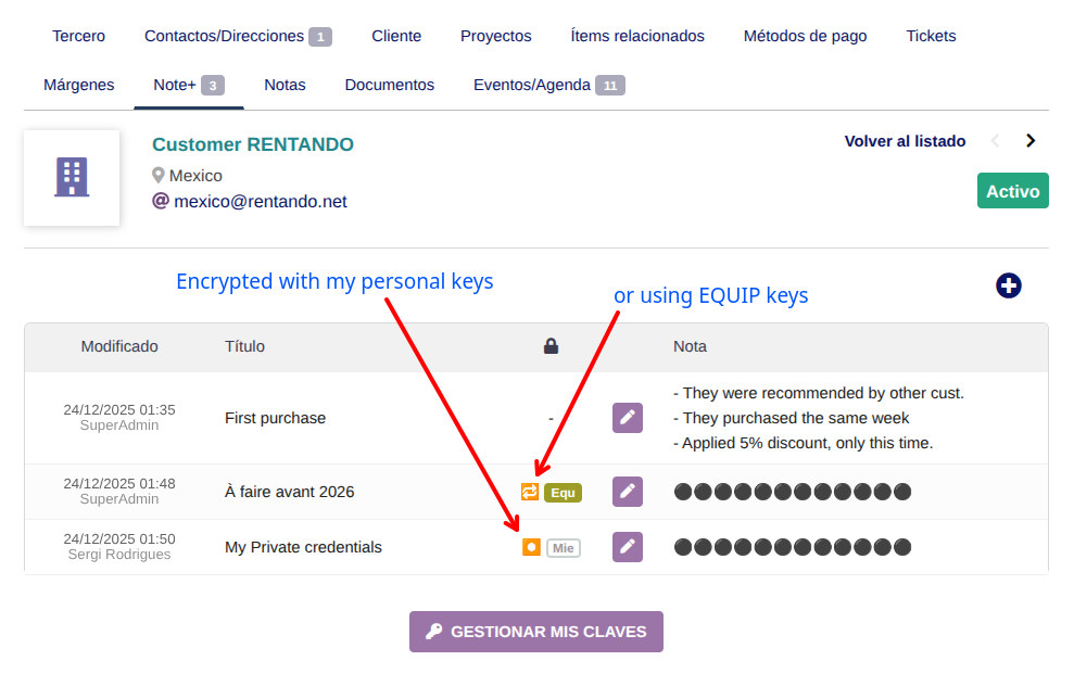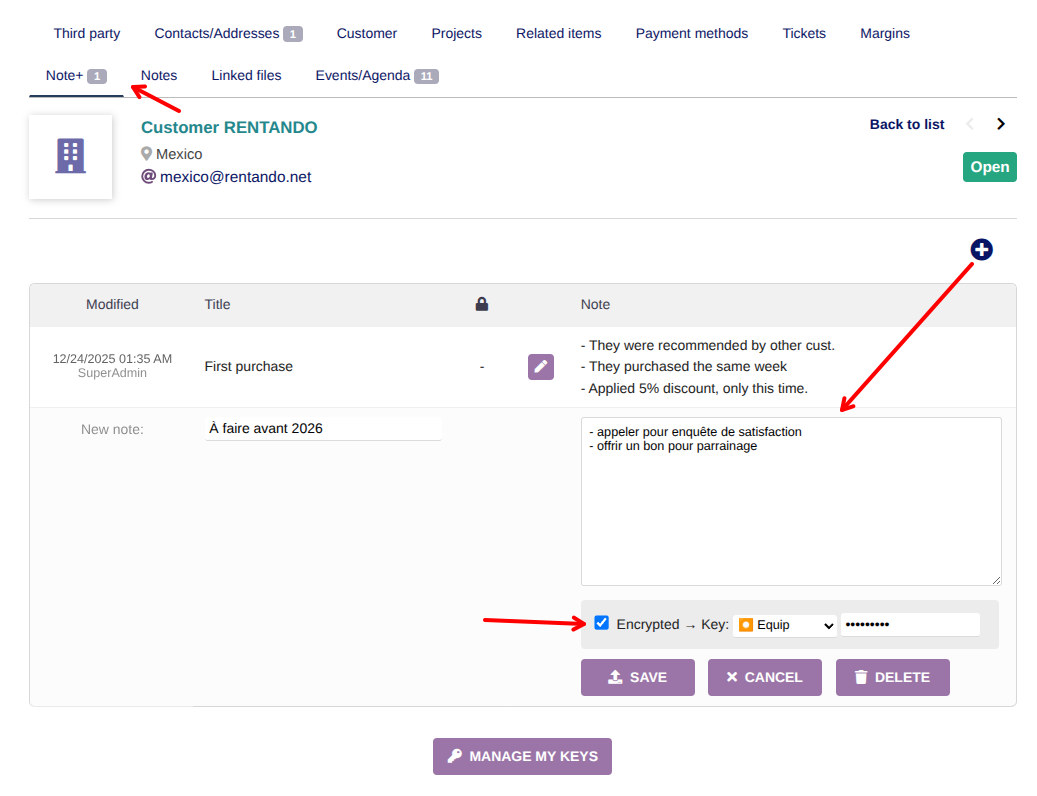 Étends la fonction native de notes dans Dolibarr en permettant d'ajouter des notes illimitées et hautement sécurisées à presque n'importe quel élément de l'ERP, avec chiffrement AES-256, clés personnelles/partagées, gestion de mots de passe par PBKDF2 et compatibilité multi-sociétés. IMASDEWEB.
