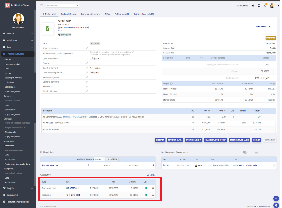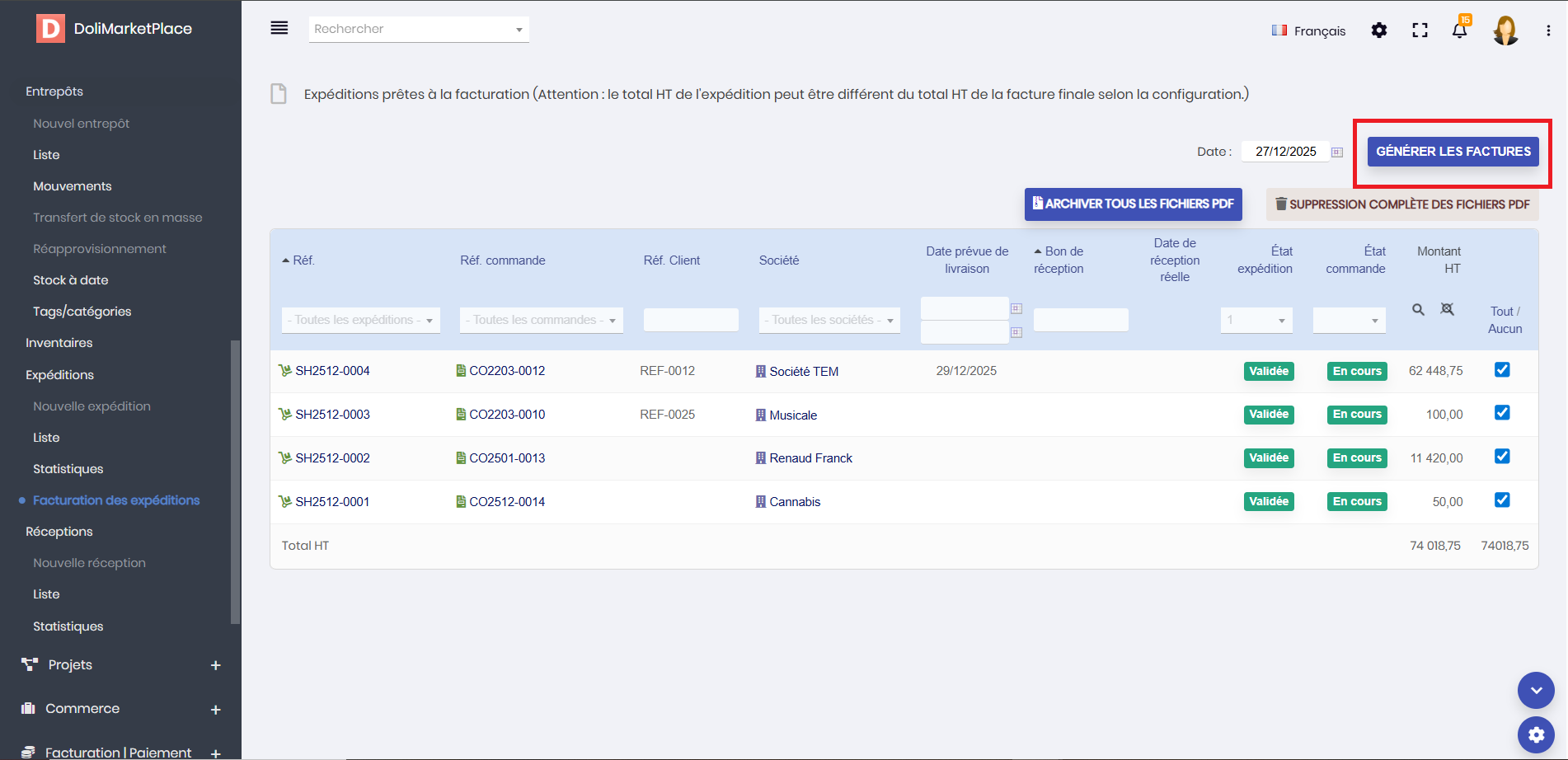 BillingShip is a module designed to simplify the invoicing process by allowing you to associate all your shipments with a single invoice for the same customer. This module facilitates the management of shipments by consolidating shipping costs, which allows you to save time when planning your invoicing operations.