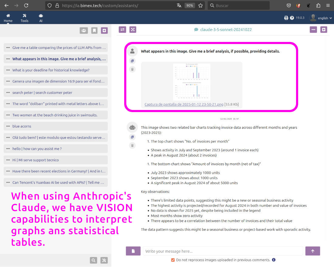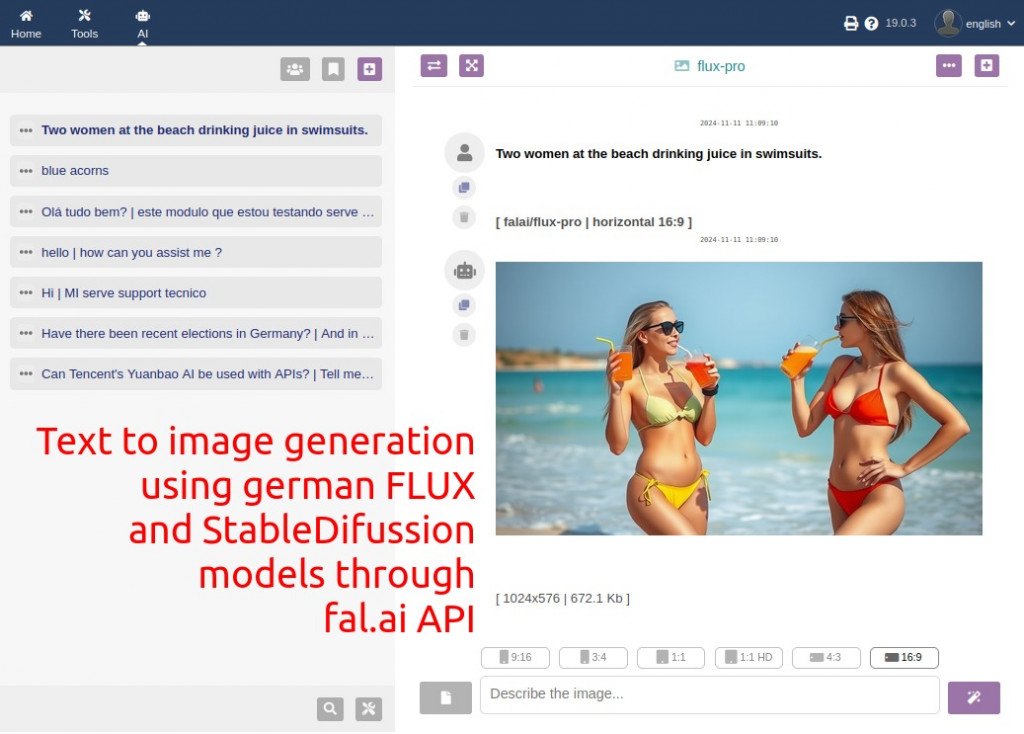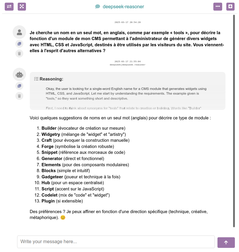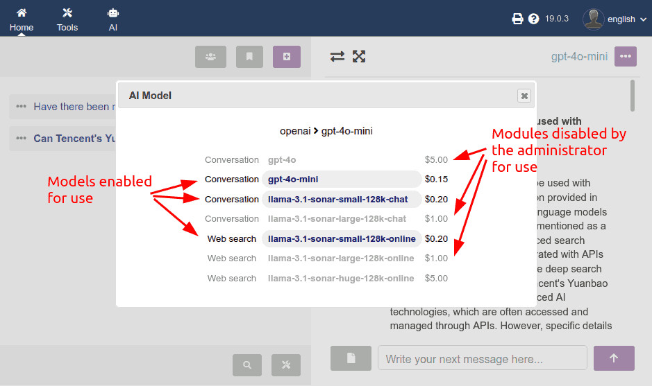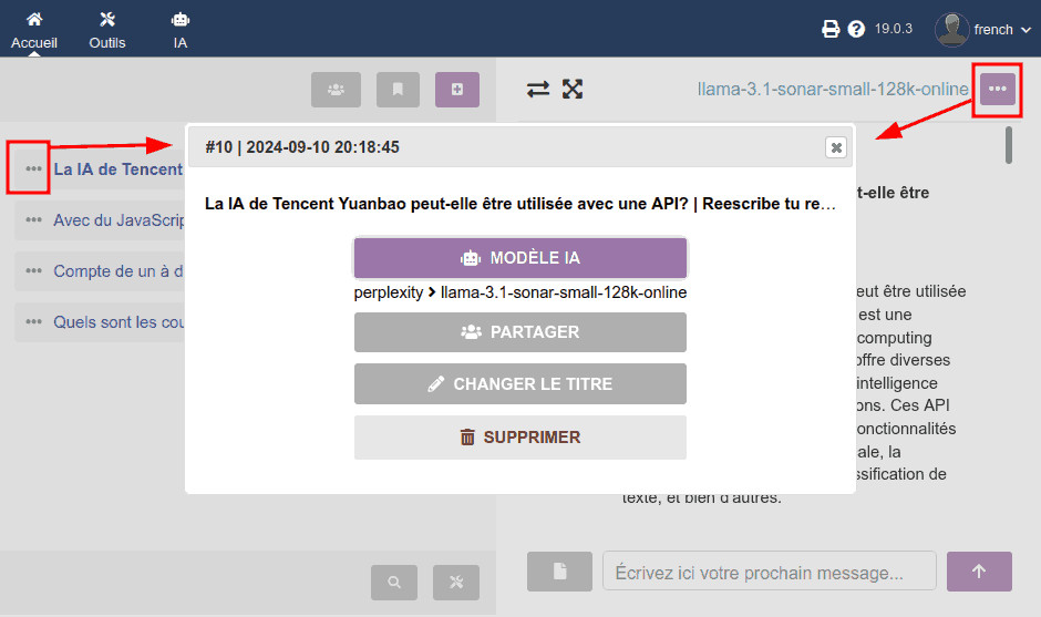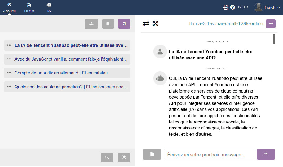 - Interface multi-IA : ce module intègre la connexion par API aux services d'IA de différents fournisseurs pour différents usages. Chat conversationnel, recherche sur internet, génération d'images, transcription audio (prochainement), etc. De plus, l'utilisateur peut changer d'IA au milieu d'une conversation, autant de fois que nécessaire !
