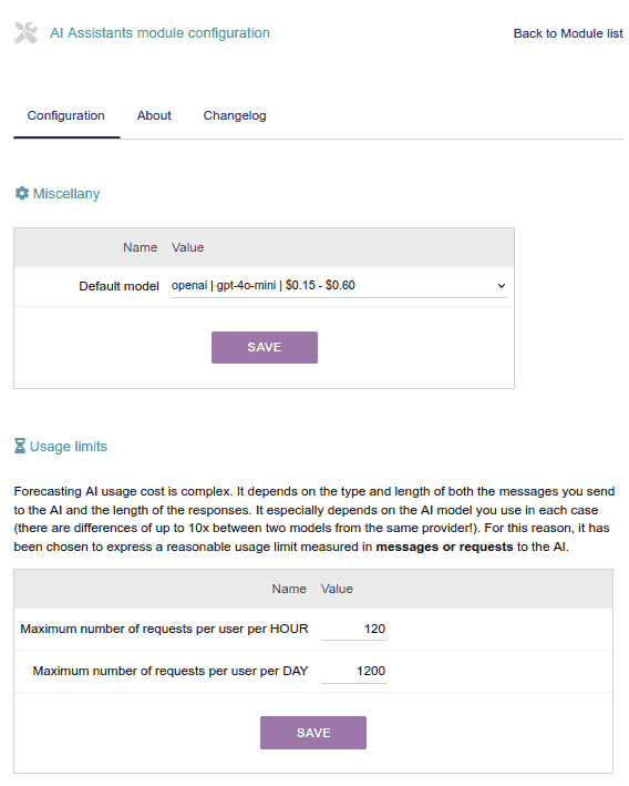 - Ce module n'inclut ni ne fournit aucun service d'IA. Vous devez ouvrir vous-même un compte chez le fournisseur qui vous intéresse (vous trouverez le lien direct dans la section de configuration du module) et obtenir une clé API secrète à placer dans la configuration de ce module.