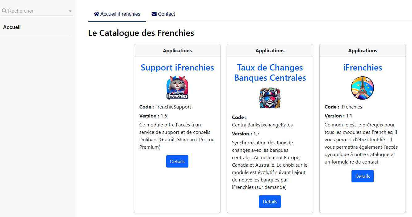 This module is the prerequisite for all the Frenchies' modules; it allows you to be identified... It will also provide dynamic access to our Catalog and a contact form if your Dolibarr account has an address defined.
