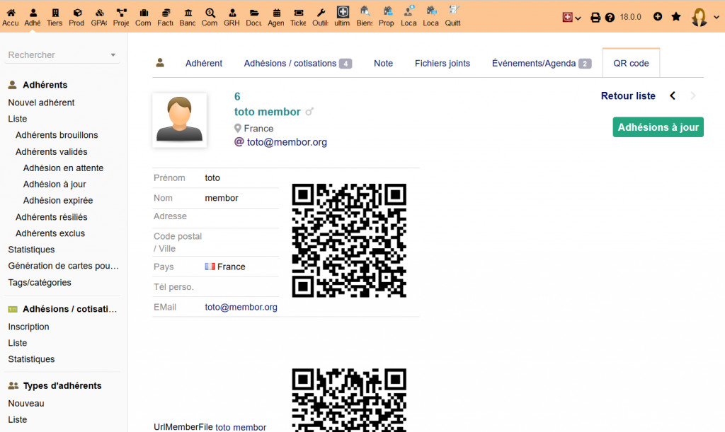Adds a QRcode tab to the Third Party Cards, Products/Services, Members, Orders, Intervention, Stock, in which a QRcode will be created on the fly.