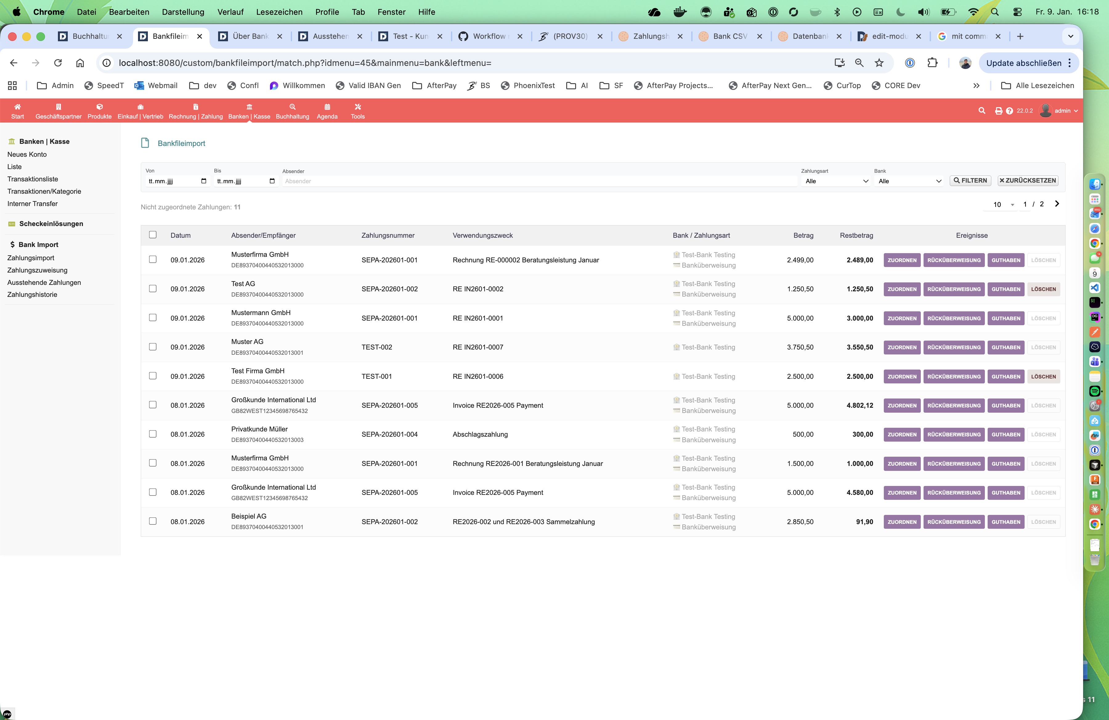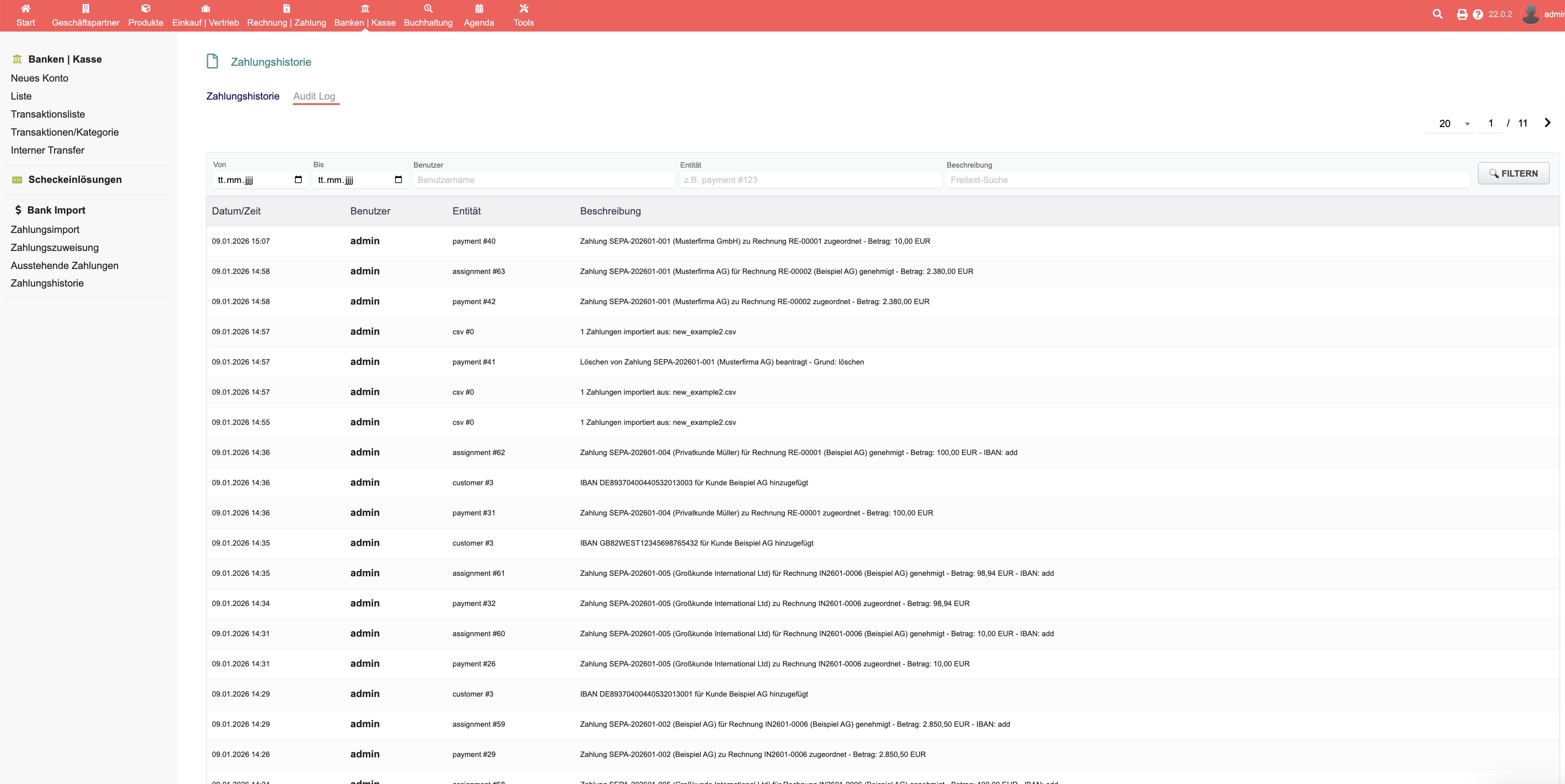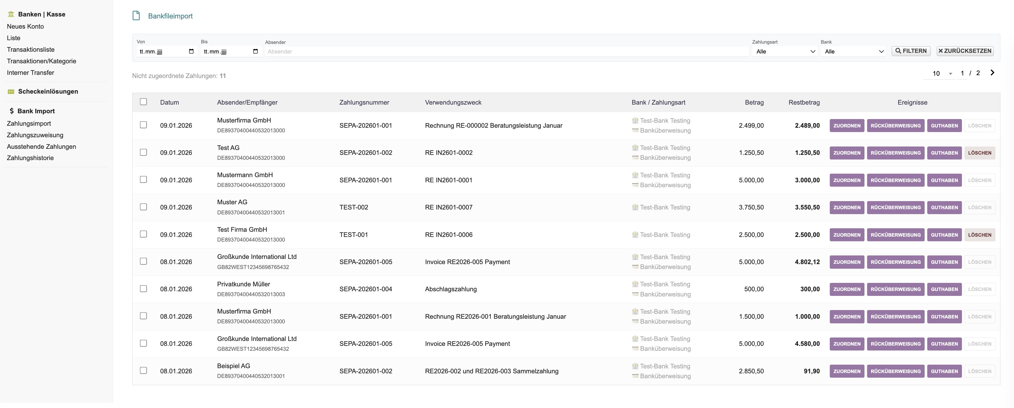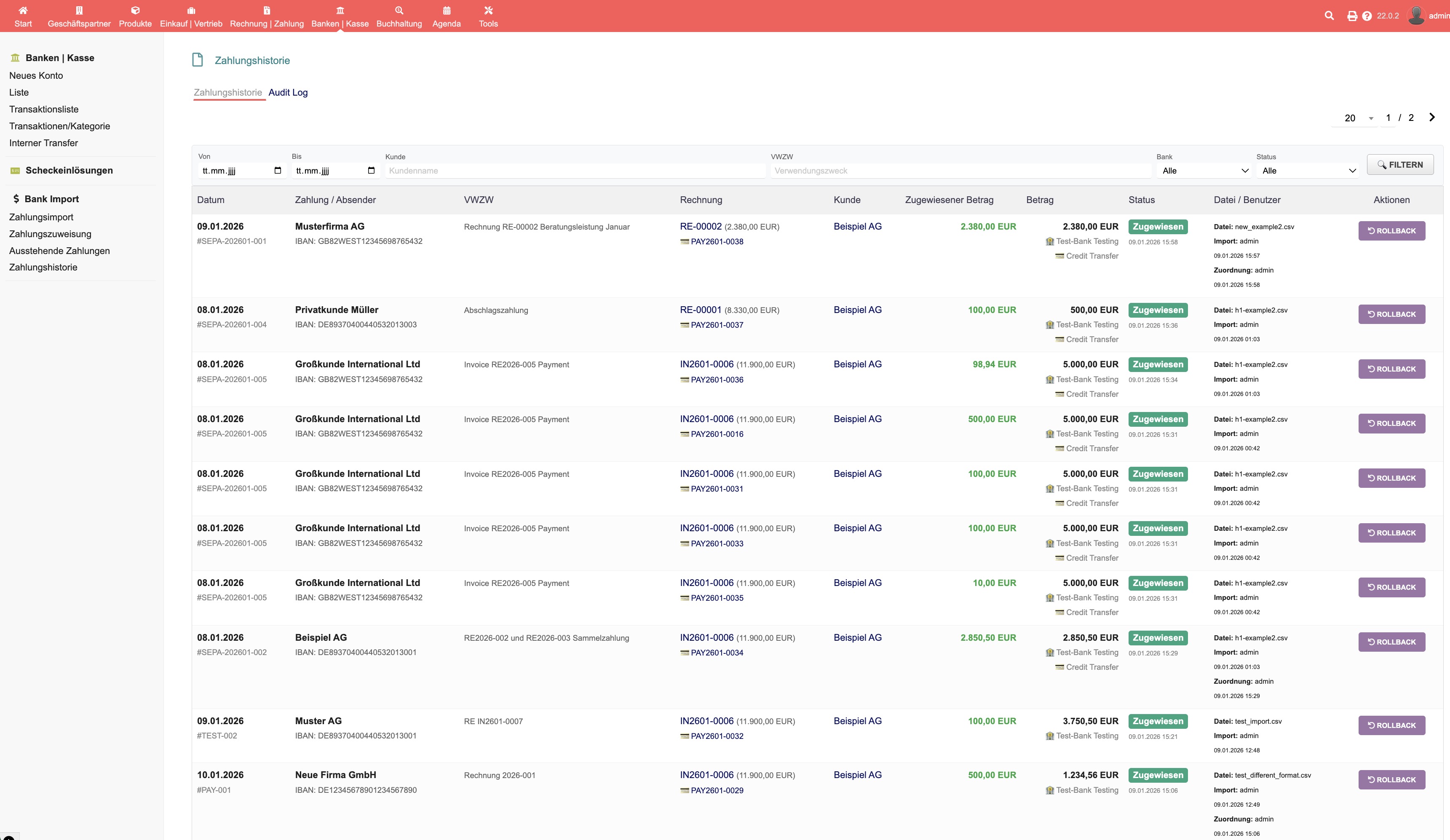 Automated import of bank CSV files with intelligent invoice matching. IBAN recognition, smart payment assignment, and comprehensive audit logging for efficient payment processing.