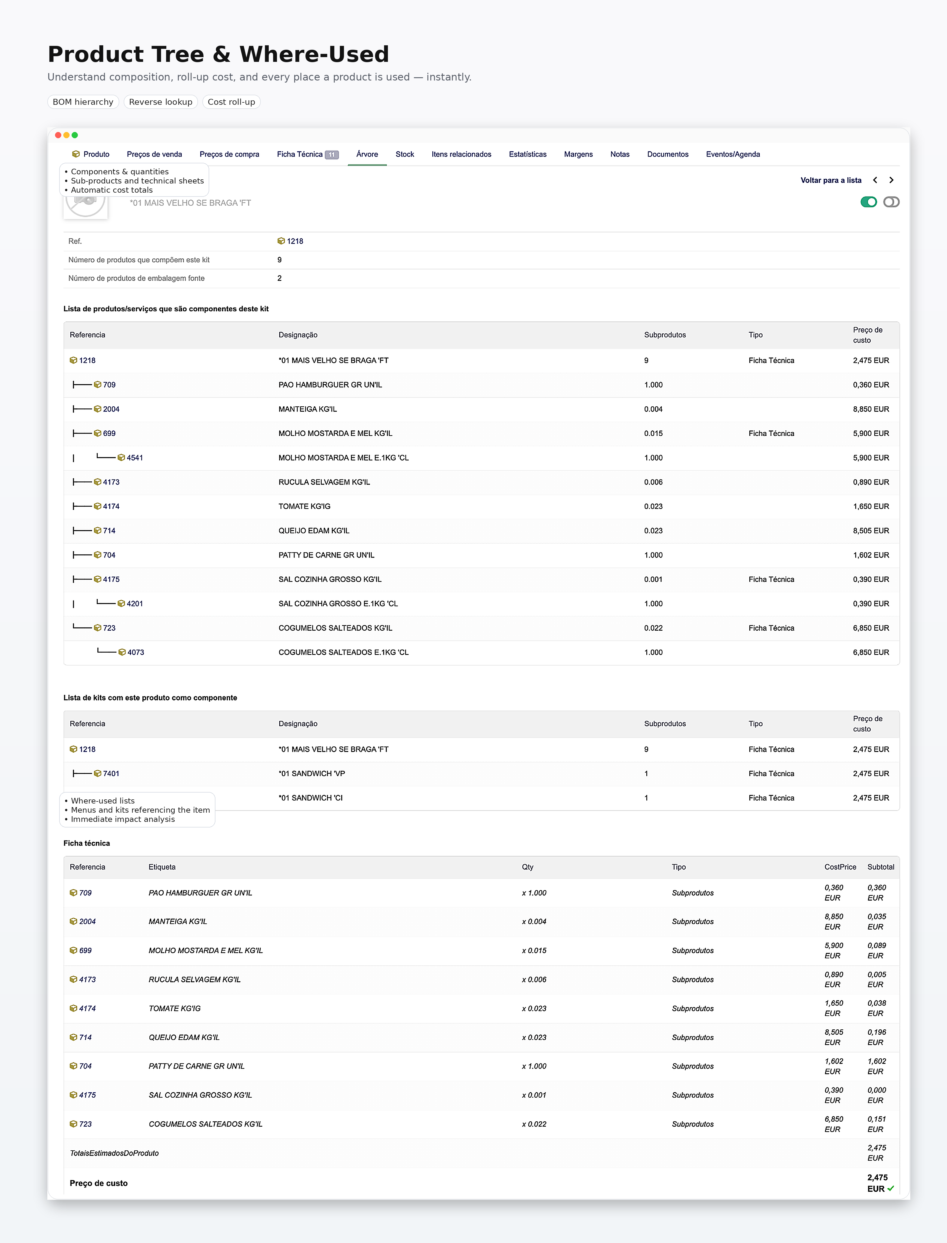 Traçabilité complète de la structure produit, des dépendances (“où utilisé”) et des conversions de conditionnement.