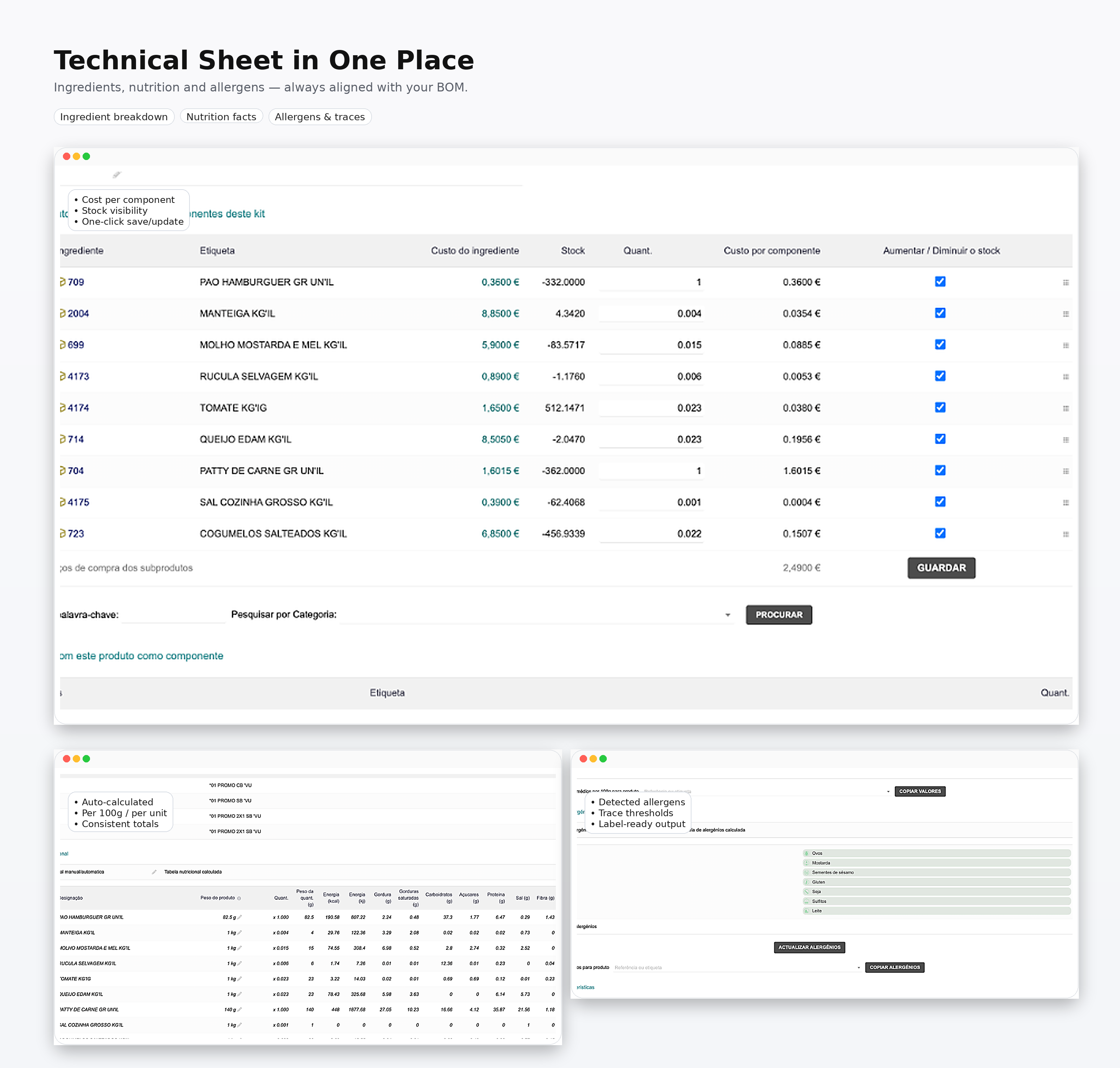 Food cost & marges fiables grâce au recalcul automatique des coûts sur les recettes et produits finis.