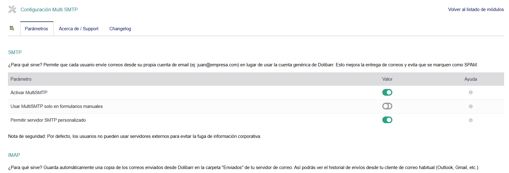 El módulo MultiSMTP automatiza la configuración de SMTP para cada usuario, lo que permite enviar correos electrónicos desde cuentas personales (john@company.com) en lugar de una cuenta genérica. También incluye compatibilidad con IMAP para guardar automáticamente copias de los correos electrónicos enviados.