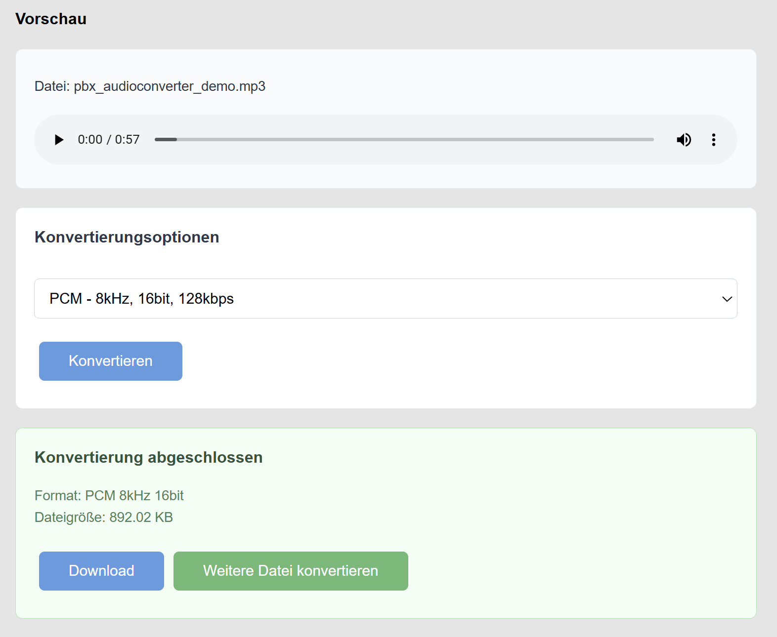 The module provides an intuitive drag‑and‑drop interface, real‑time progress display, audio preview, and easy downloading of the converted file. This makes it ideal for preparing audio prompts, announcements, IVR recordings, voicemail greetings, and other telephony-related audio assets directly inside Dolibarr — without external tools or manual reconfiguration.