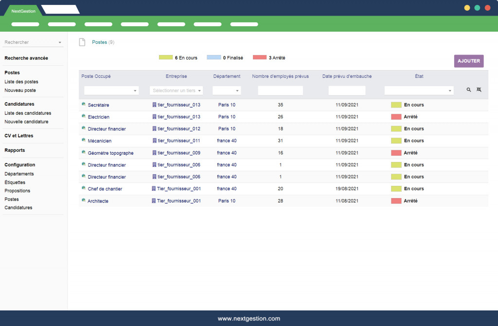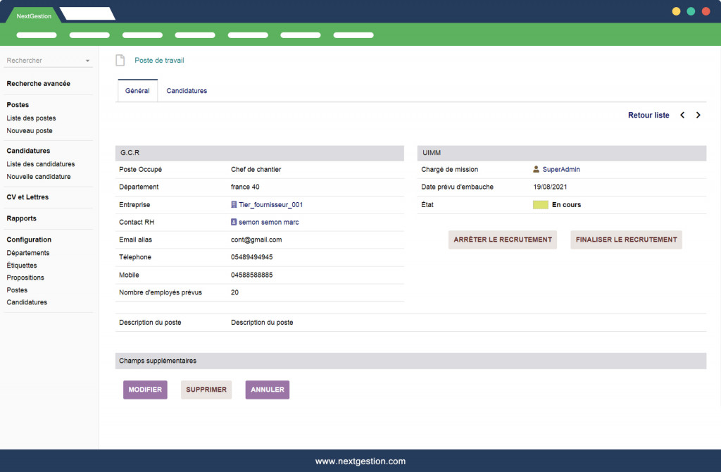 Met de TALENT PLUS-module: RECRUITMENT FIRM MANAGEMENT kunt u de wervingsactiviteiten binnen uw structuur intern of extern beheren voor andere bedrijven als u recruiter of headhunter bent. Met de module kunt u: - beheer van de werving voor uw rekruteringsbureau; - Lanceerposities waarnaar u op zoek bent; - sollicitaties voor elke functie zoeken en invoeren; - voer alle informatie van een profiel in: beroepservaring, studieniveau, persoonlijke informatie, CV, sollicitatiebrief, afdeling, stad, enz. - contact opnemen met de rekruteringsmanager; - genereer de lijst met sollicitaties voor elke functie; - vrijelijk extra velden toevoegen: mogelijkheid om extra veldfuncties te hebben op de formulieren "Posities" en "Applicatie", - de module is aanpasbaar aan uw eigen activiteit dankzij de Extra Velden tool en functies; - contact opnemen met de projectmanagers; - geavanceerde zoekfunctie op de module: waarmee u kunt zoeken naar sollicitaties, functies of banen, of op stad, afdeling, of op studieniveau, stad van herkomst, technische hulpmiddelen die u beheerst... enz. - je beschikt over een geavanceerde zoekmachine op basis van de module.