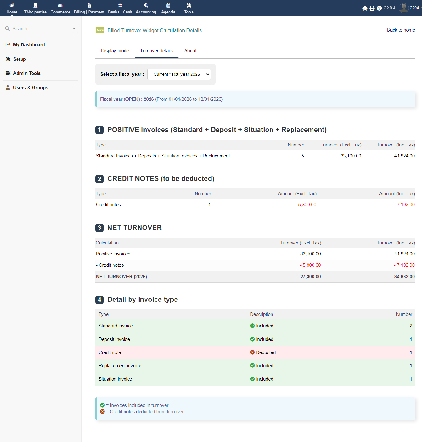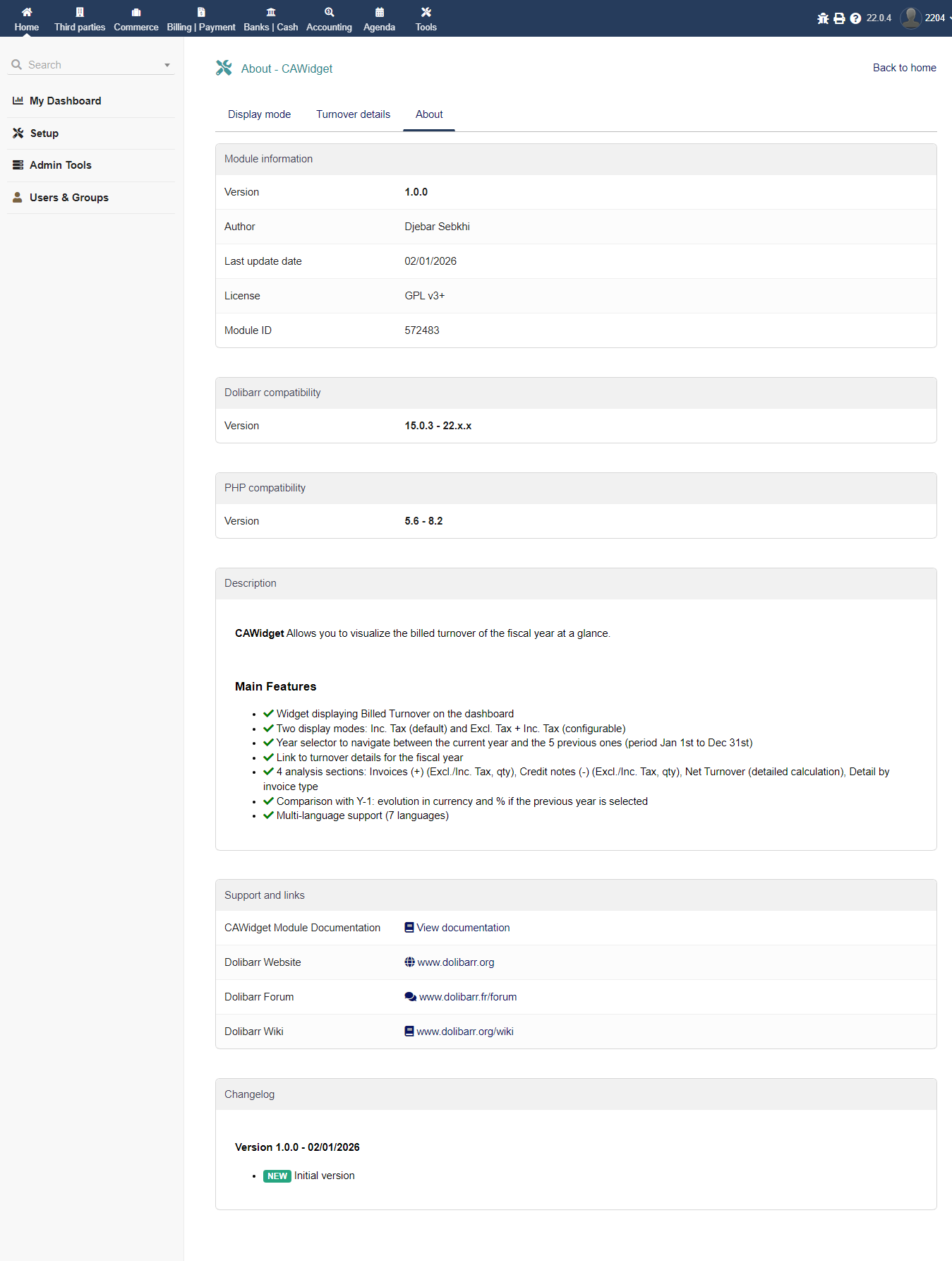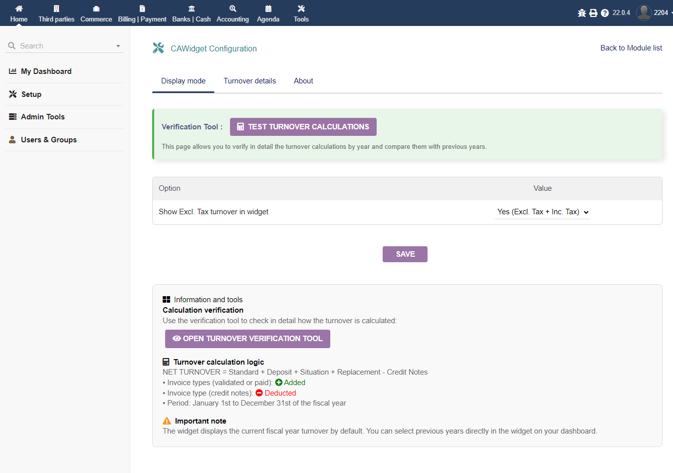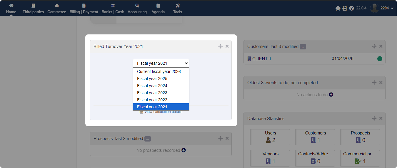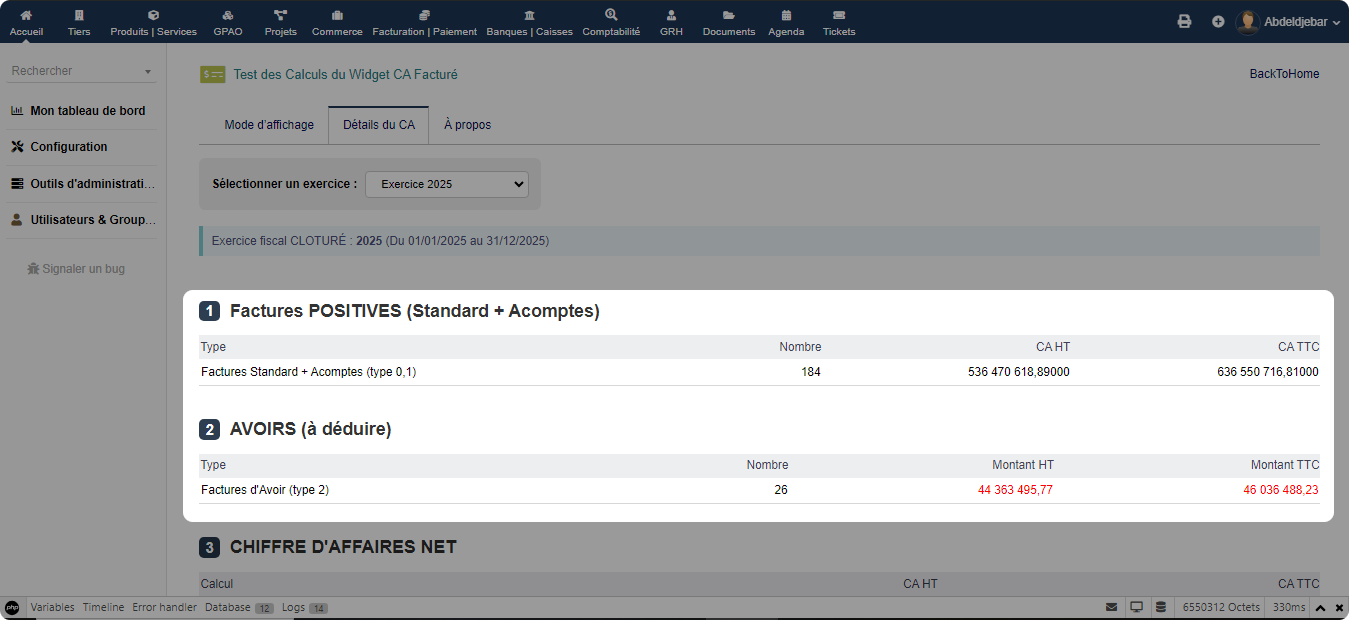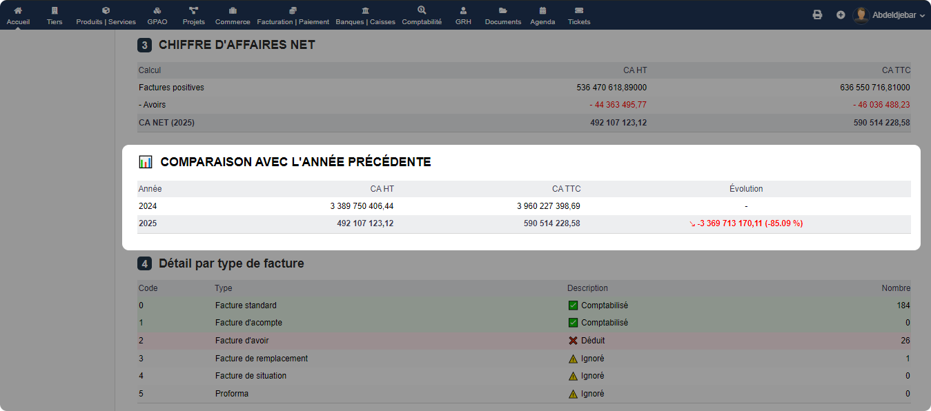 CAWidget ist ein Tool mit Doppelfunktion: ein Monitoring-Widget für den fakturierten Umsatz eines Geschäftsjahres direkt auf dem Dashboard und ein detailliertes Analysemodul für den Umsatz nach Rechnungstyp und Anzahl, einschließlich eines Vorjahresvergleichs (N-1), wenn das Vorjahr ausgewählt ist.