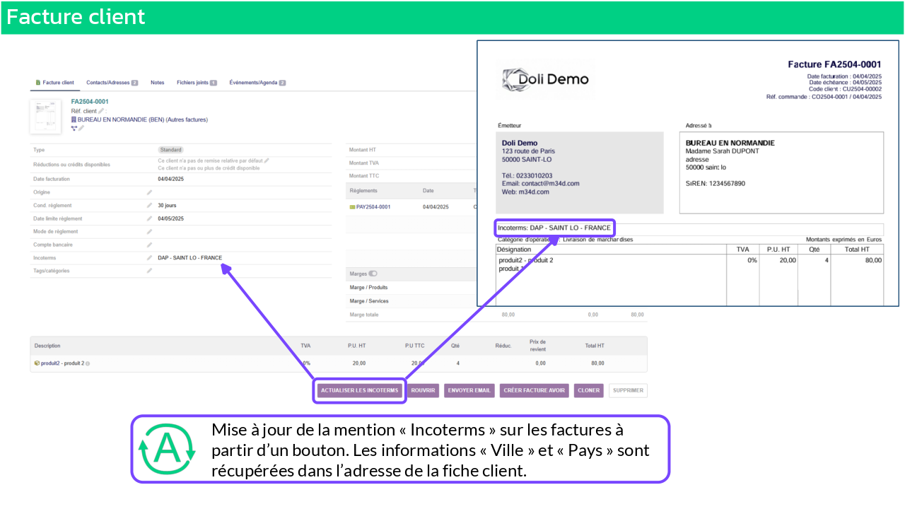 Automatically and quickly update your customers' Incoterms with the city and country indicated in their address. Display the city and country in the Incoterms mention on customer commercial documents (quotes, orders, shipments, invoices).