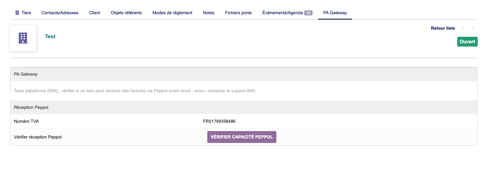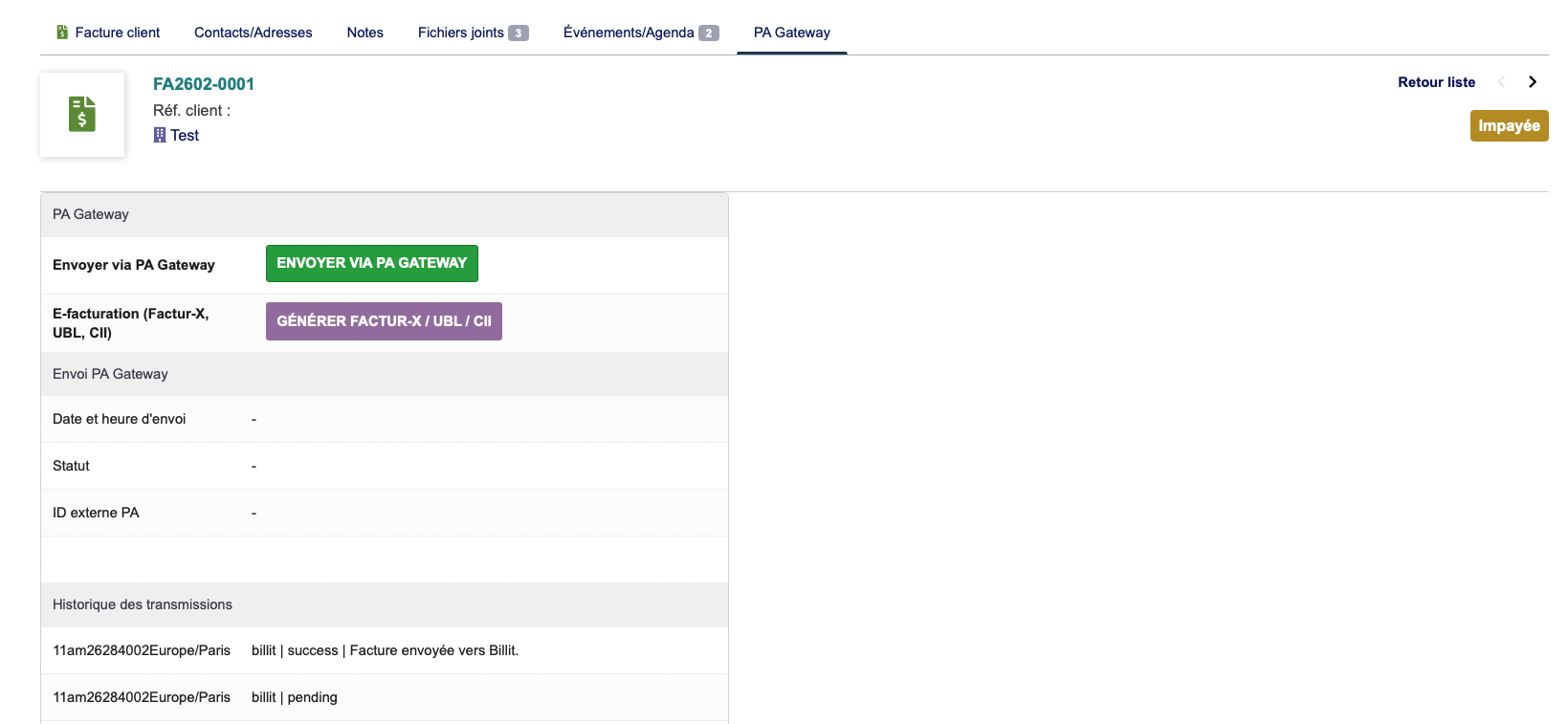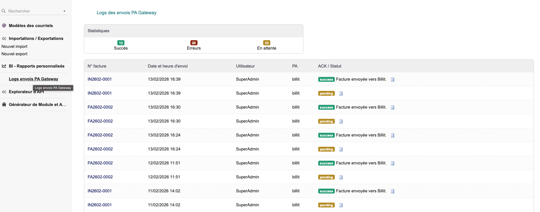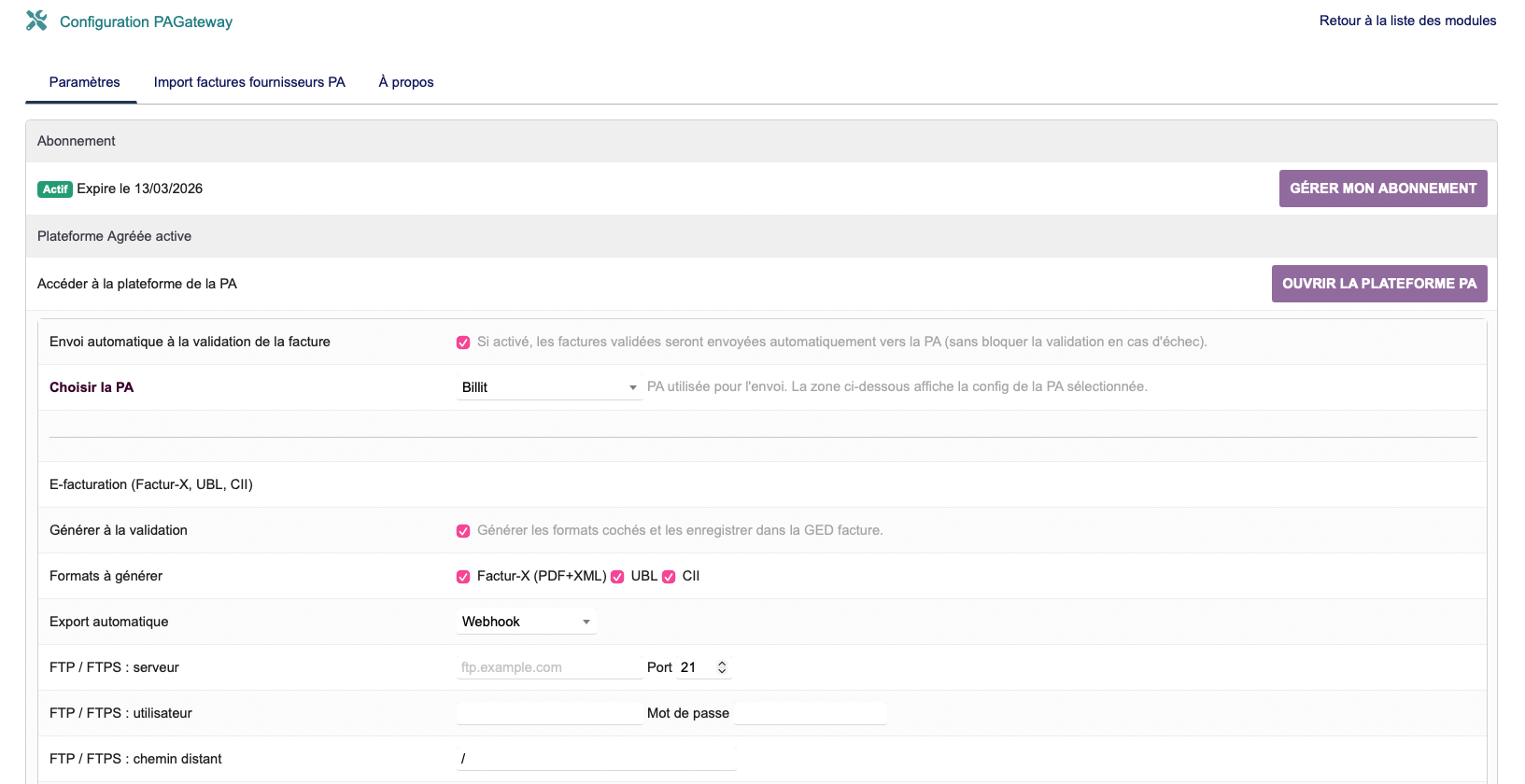 PAGateway is a Dolibarr module (version 1.2.2) designed to connect Dolibarr with an Approved Platform (PA), such as Billit, to manage electronic invoicing workflows.
