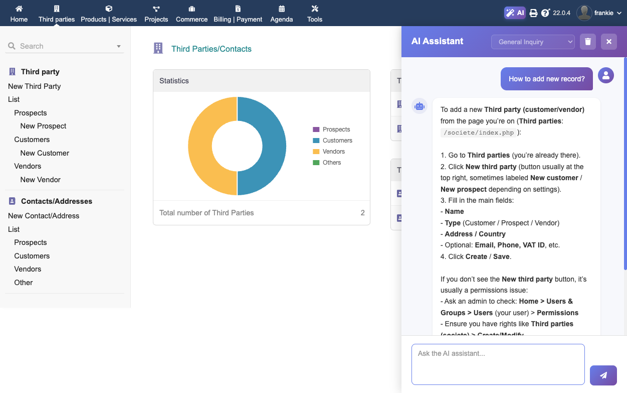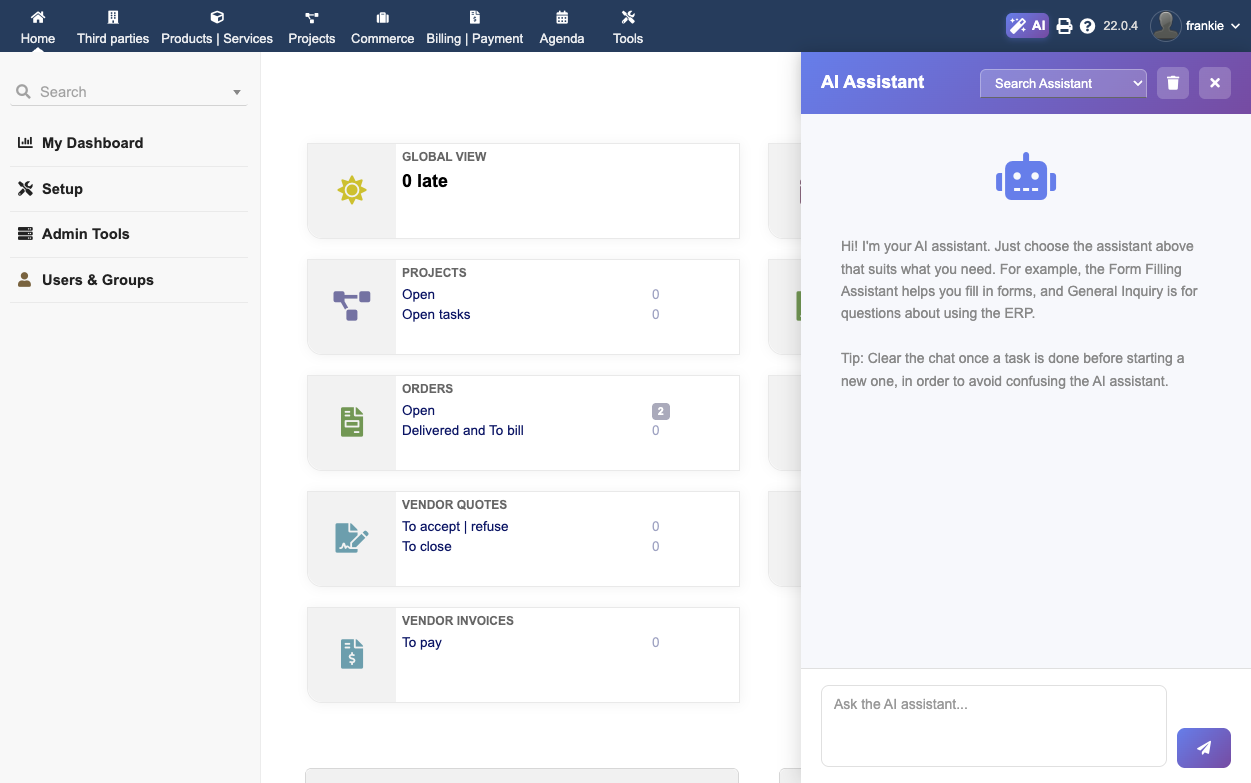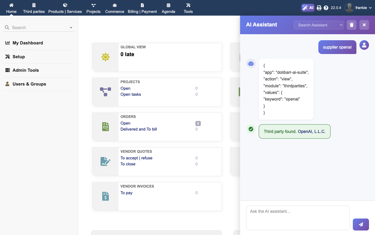 AI Suite integrates an AI assistant panel into Dolibarr ERP, offering context-aware help with a sleek, slide-in interface and real-time streaming responses. Your ERP database data is never sent to AI providers. The AI simply interprets your natural language requests, then Dolibarr handles all the actual data operations internally.