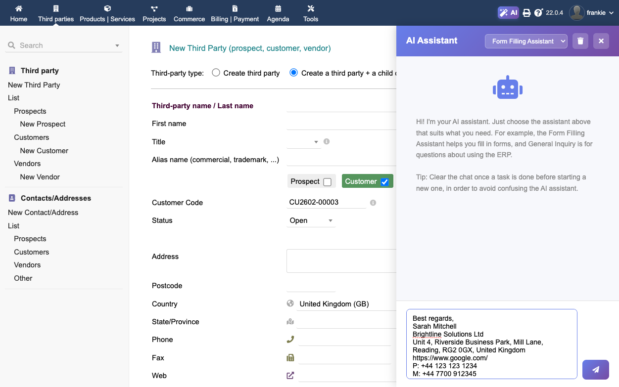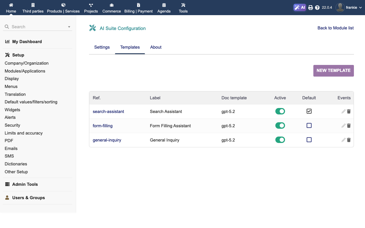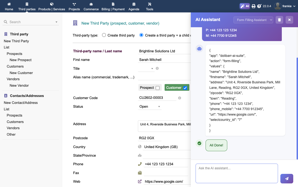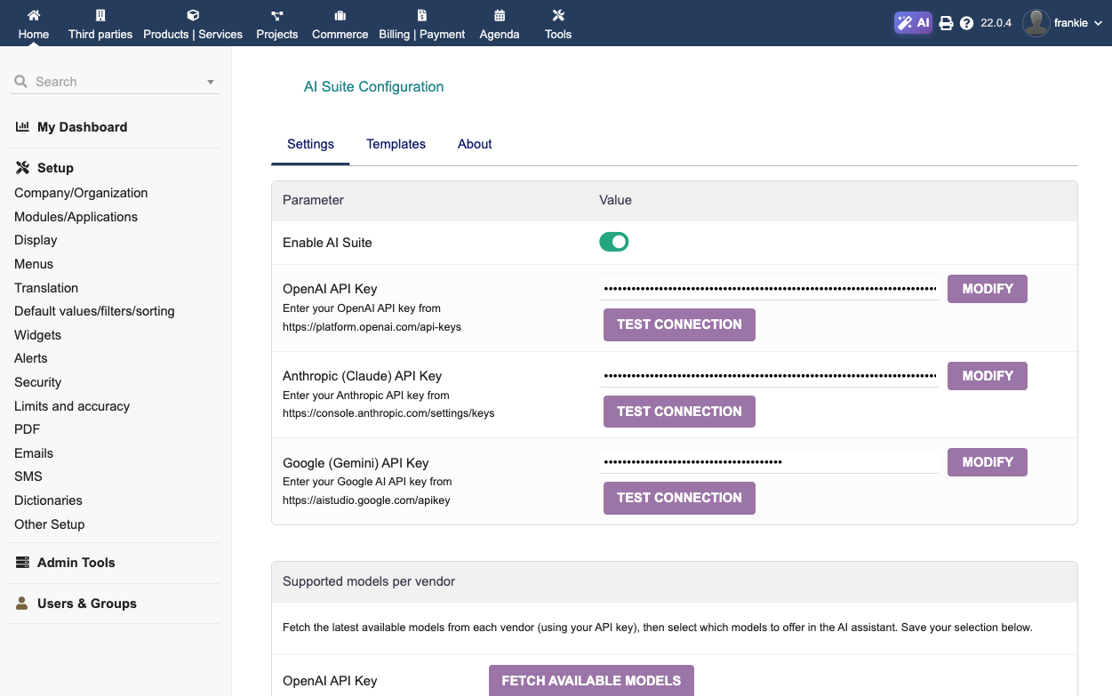AI Suite integrates an AI assistant panel into Dolibarr ERP, offering context-aware help with a sleek, slide-in interface and real-time streaming responses. Your ERP database data is never sent to AI providers. The AI simply interprets your natural language requests, then Dolibarr handles all the actual data operations internally.