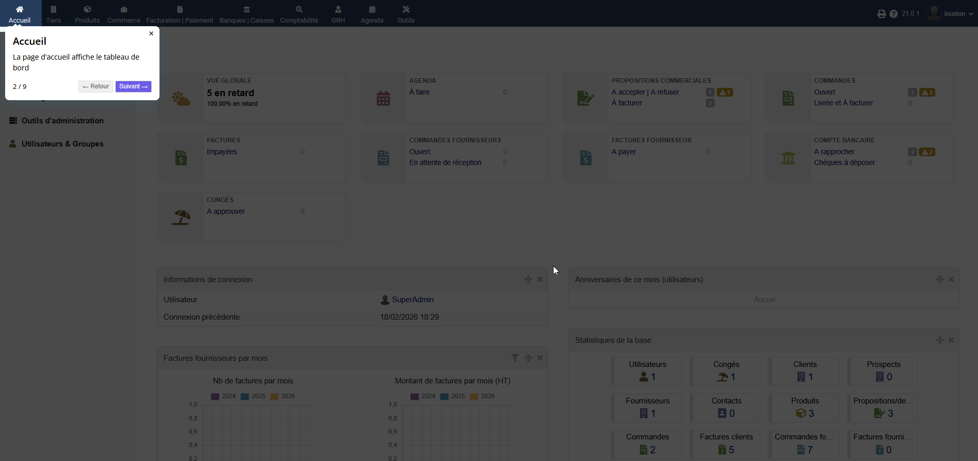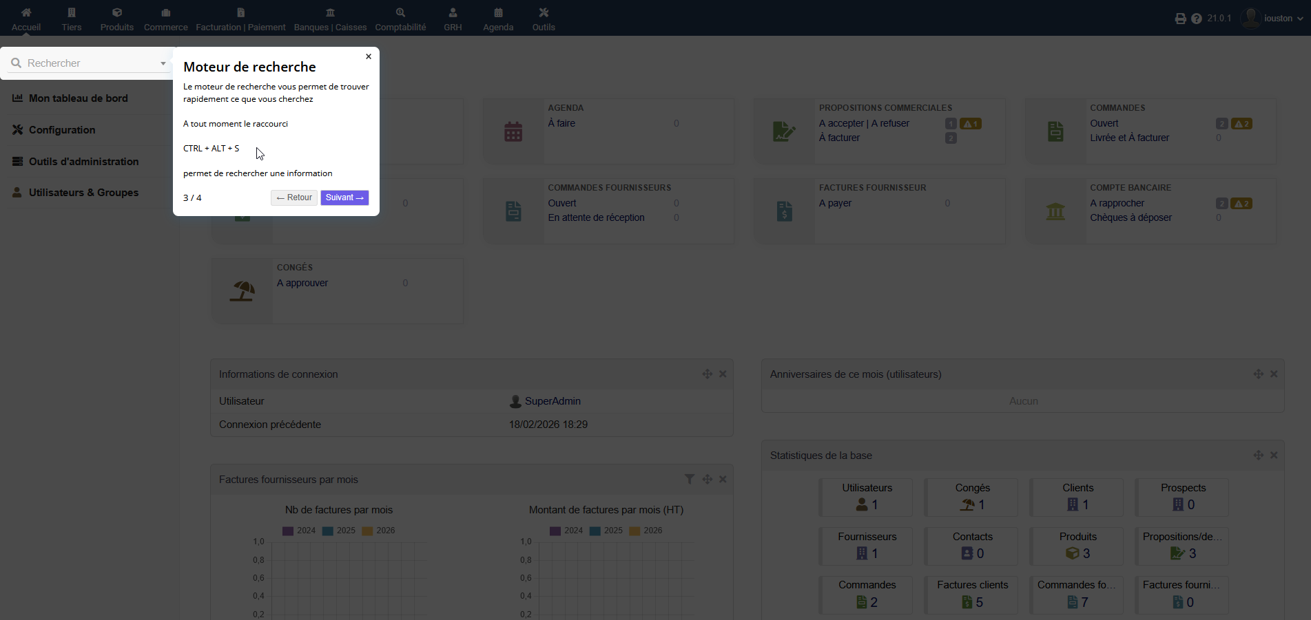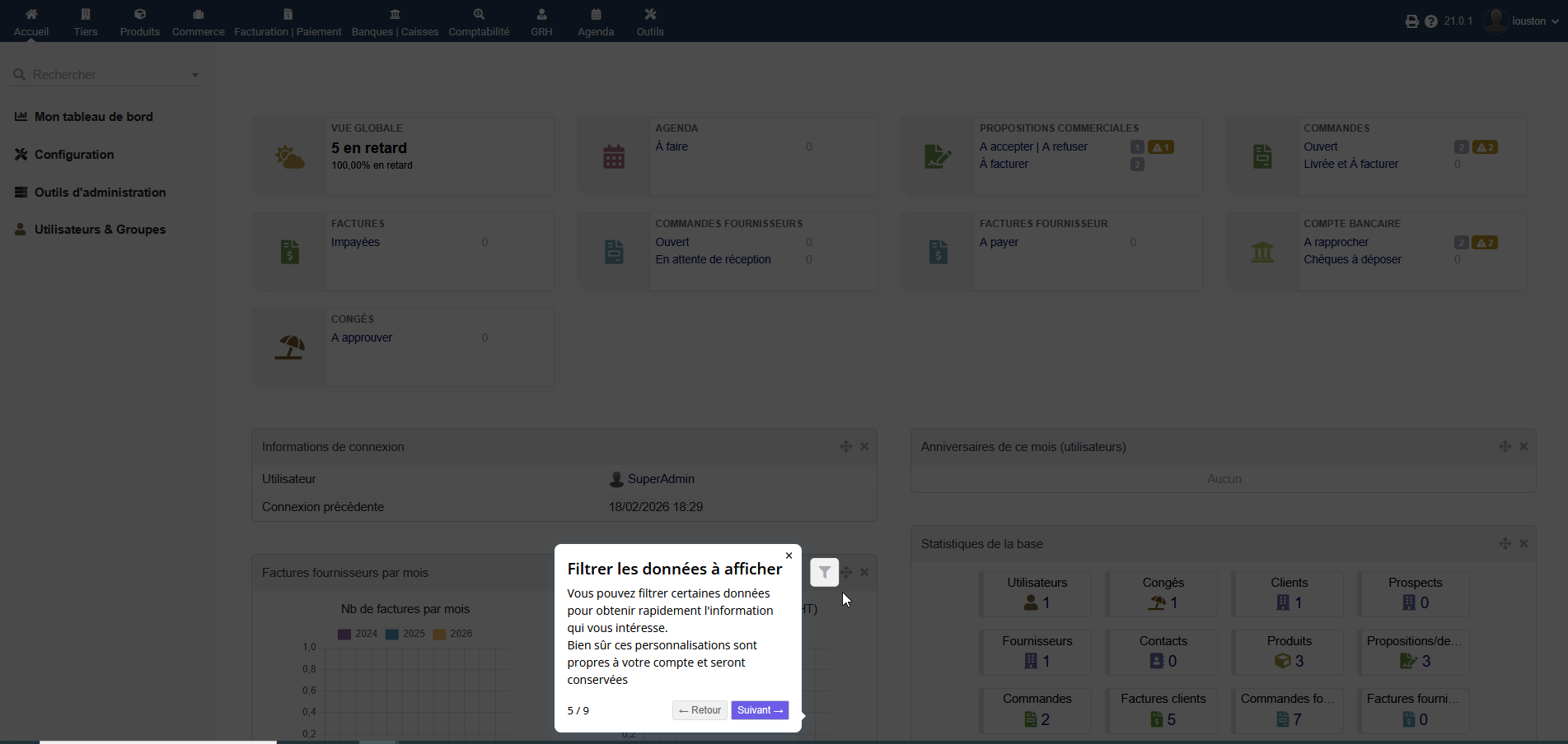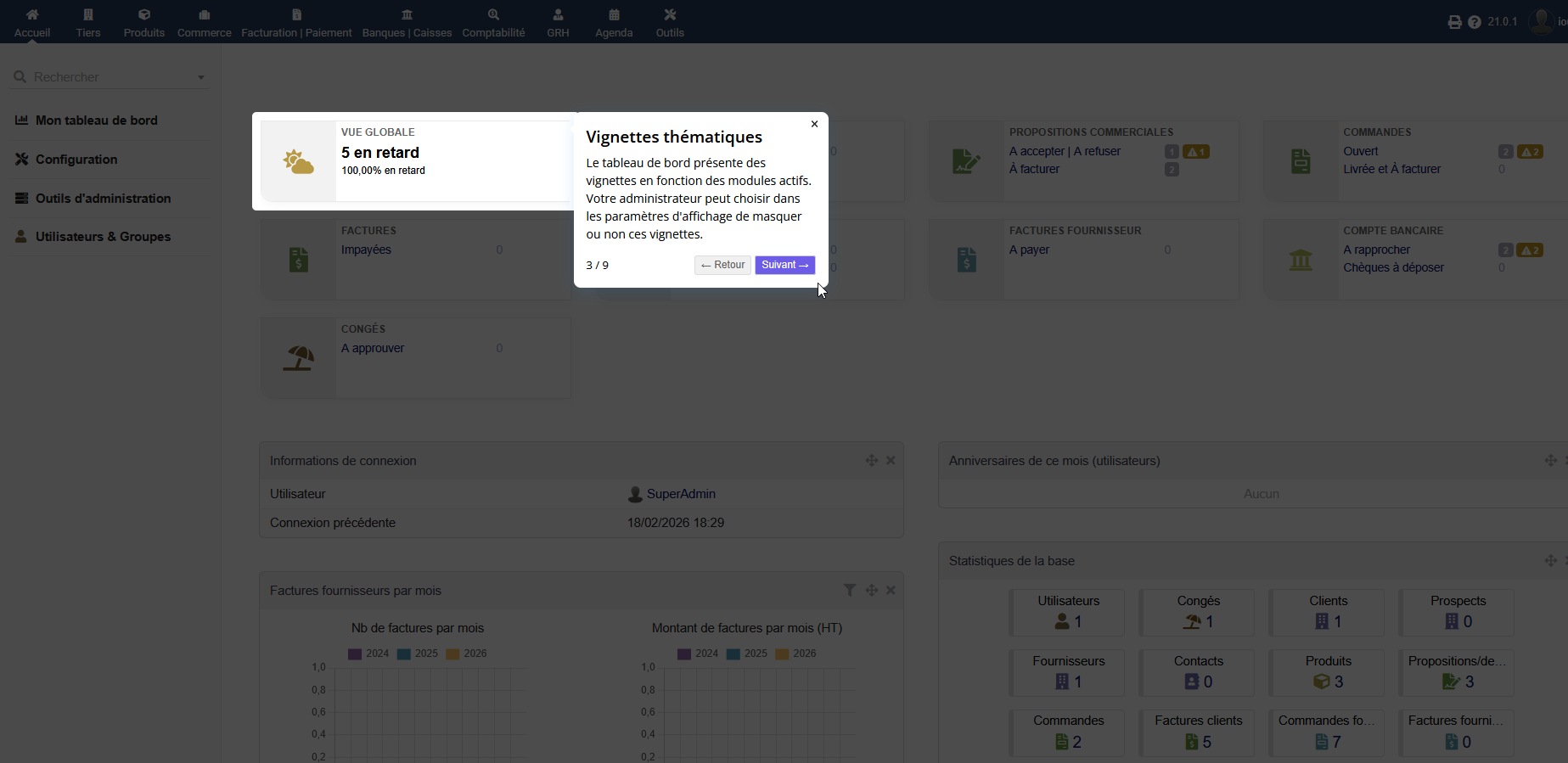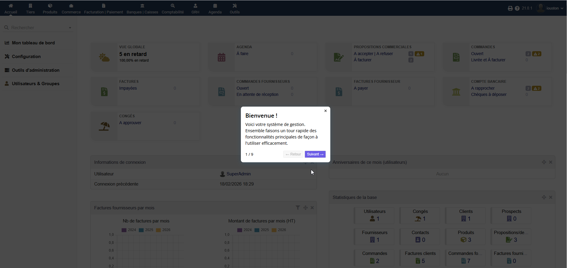 This Dolibarr module displays contextualized windows that help users get started with the software. You can edit your own screens (onboarding) to suit your operations and processes.