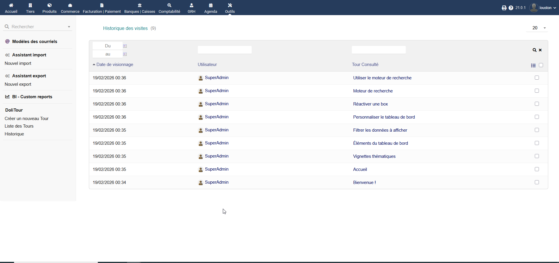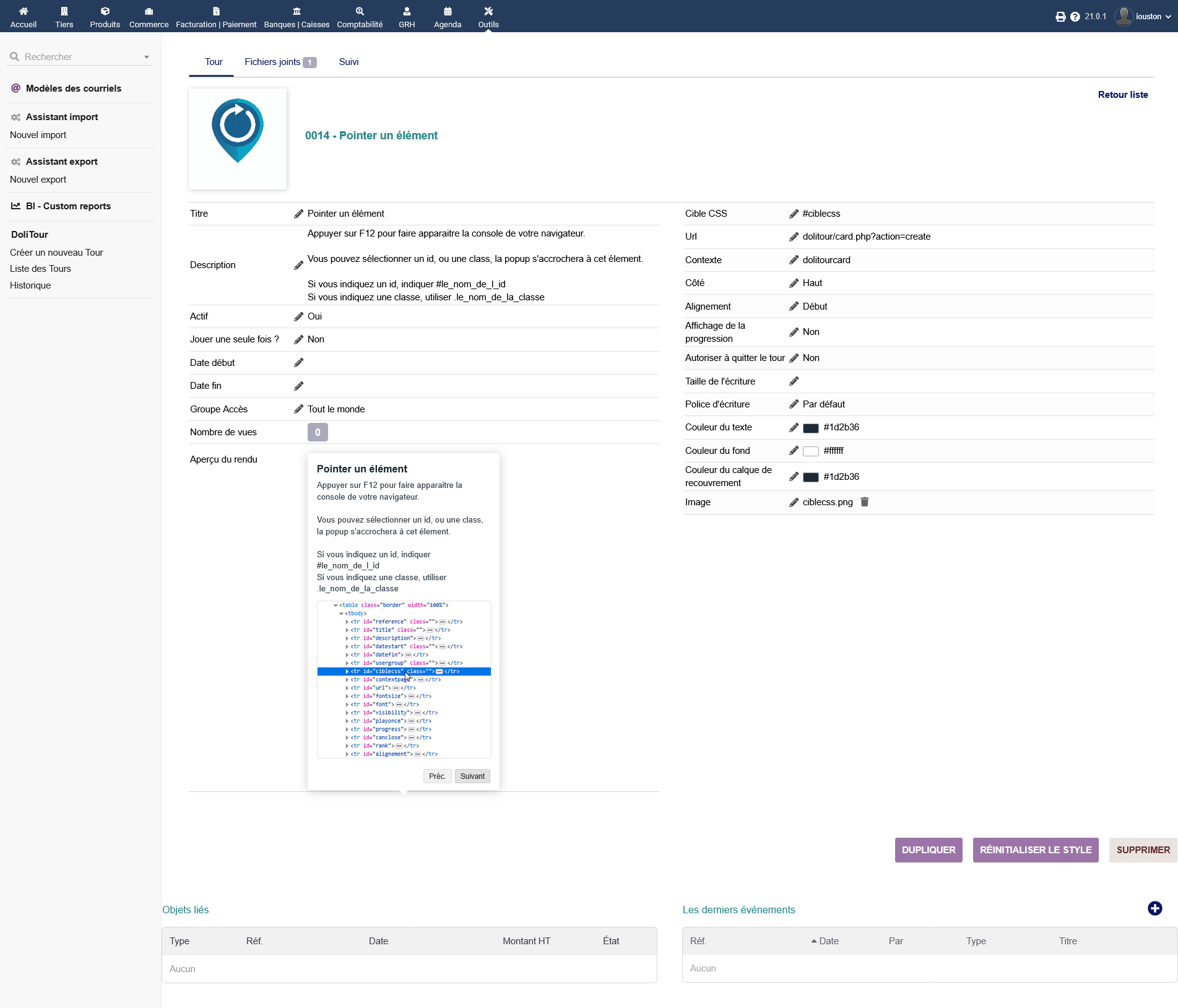 Dolitour allows you to create tours, presentations, pop-ups, contextualized windows, guided tours, onboarding, call it what you will, on any Dolibarr screen, whether it be native pages or pages from external modules or specific modules.