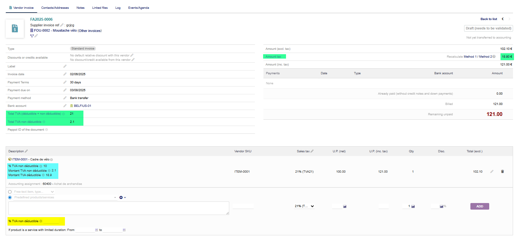 - The non-deductible VAT percentage is automatically copied from the product sheet if not already set.
