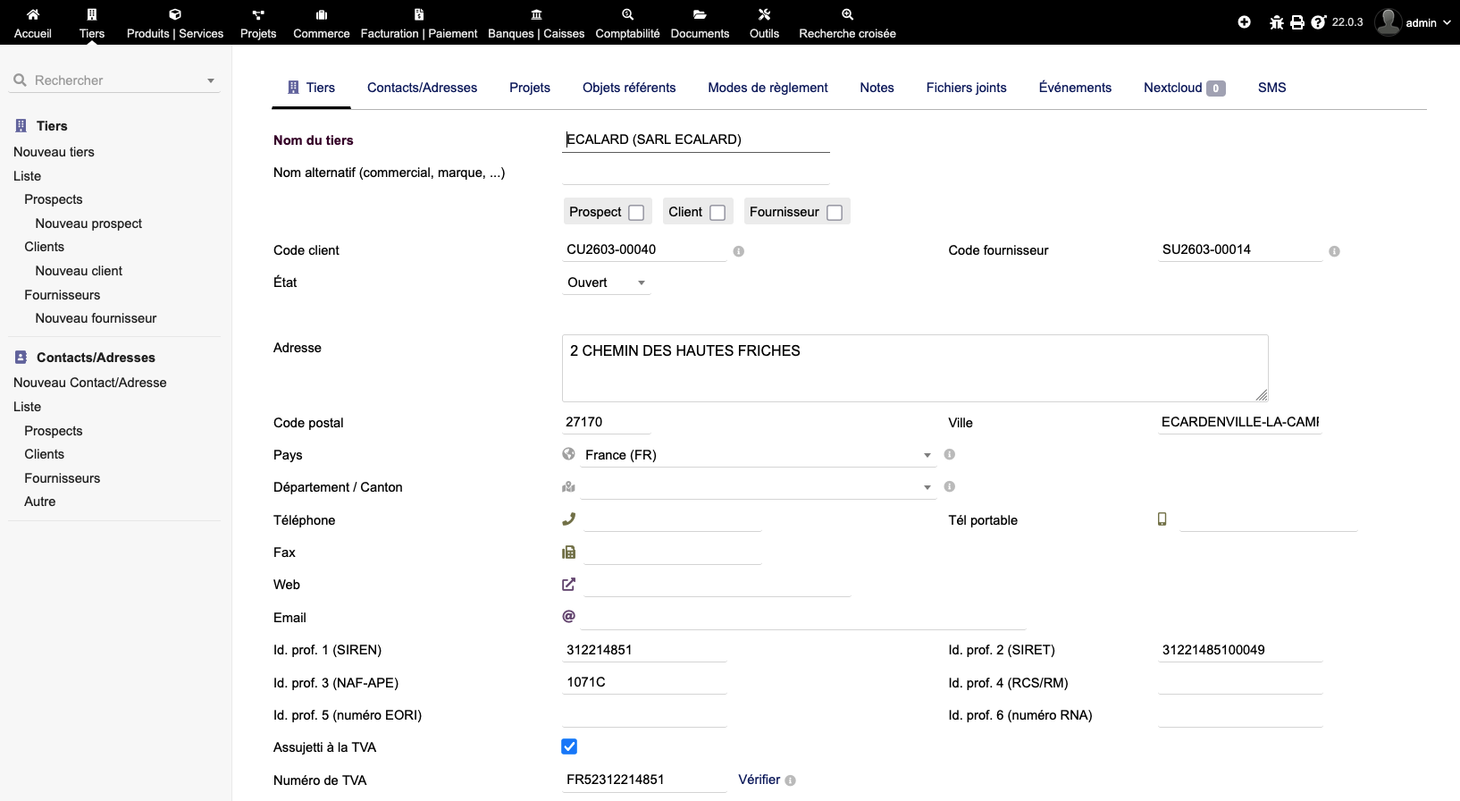 Vereinfachte Datensatz-ErstellungUm einen Datensatz für Drittpartei, Interessent, Kunde oder Lieferant anzulegen, geben Sie nur Name und Stadt ein. ClientPlus fragt die INSEE-Datenbank ab und ergänzt automatisch Kontaktdaten, SIREN, SIRET, USt-Nummer usw. Kein API-Schlüssel erforderlich für diese Hauptfunktion. |