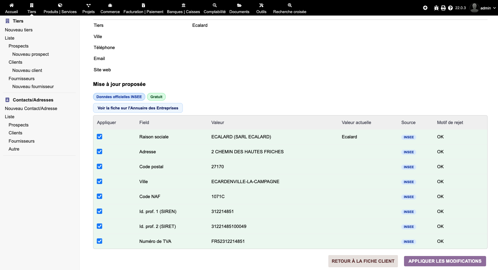 ClientPlusReichern Sie Drittparteien-Datensätze automatisch aus der offiziellen französischen INSEE-Sirene-Datenbank (Unternehmensdaten) an und ergänzen Sie optional mit KI. Prüfen Sie jede Änderung vor der Übernahme. 40,83 EUR zzgl. MwSt. |
