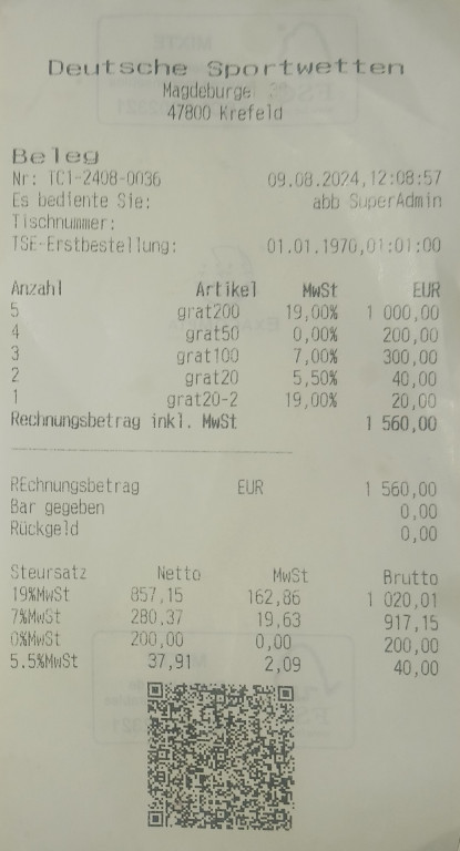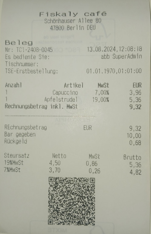 This module is an extension to the Fiskaly SignDE module in order to produce receipts that comply with German regulations. It produces identical receipts to those described in the Fiskaly receipt example.