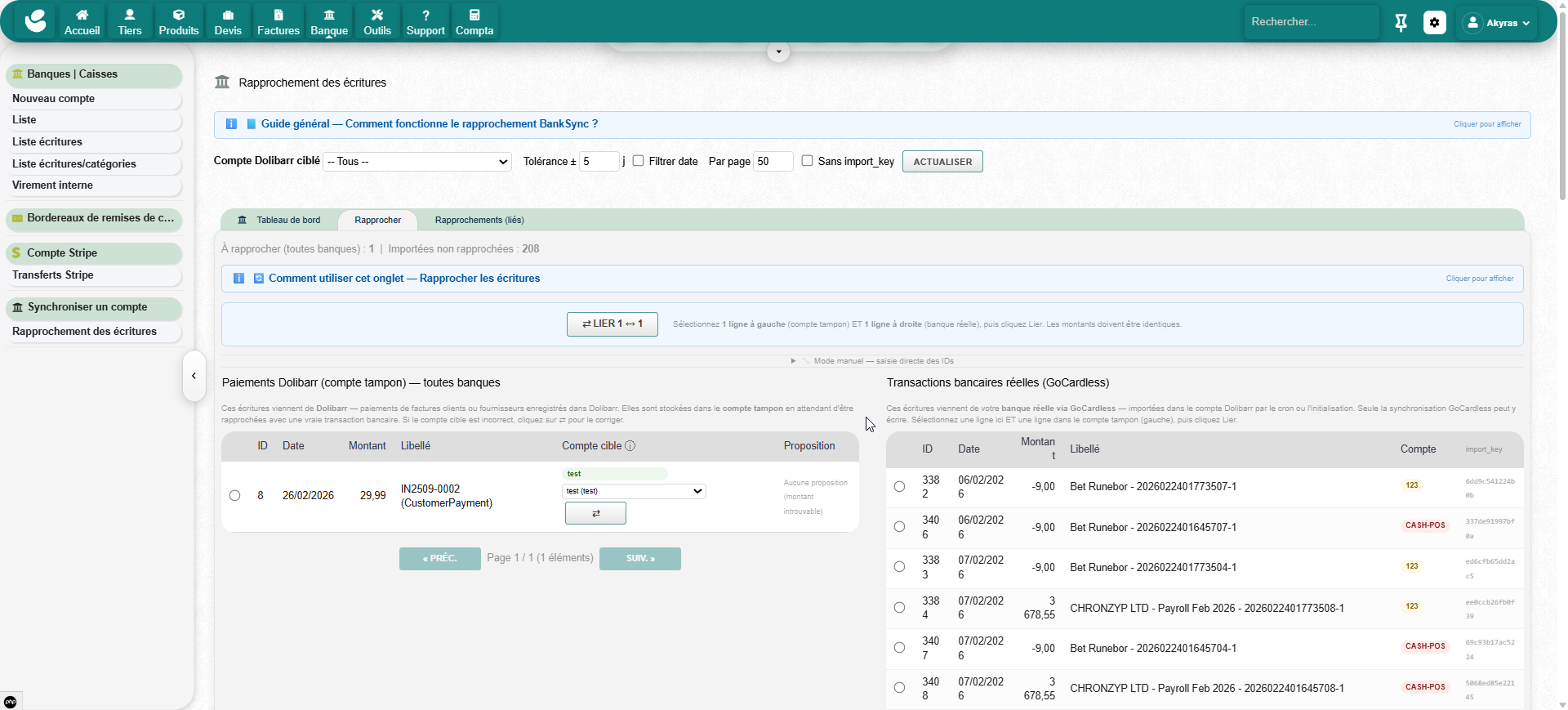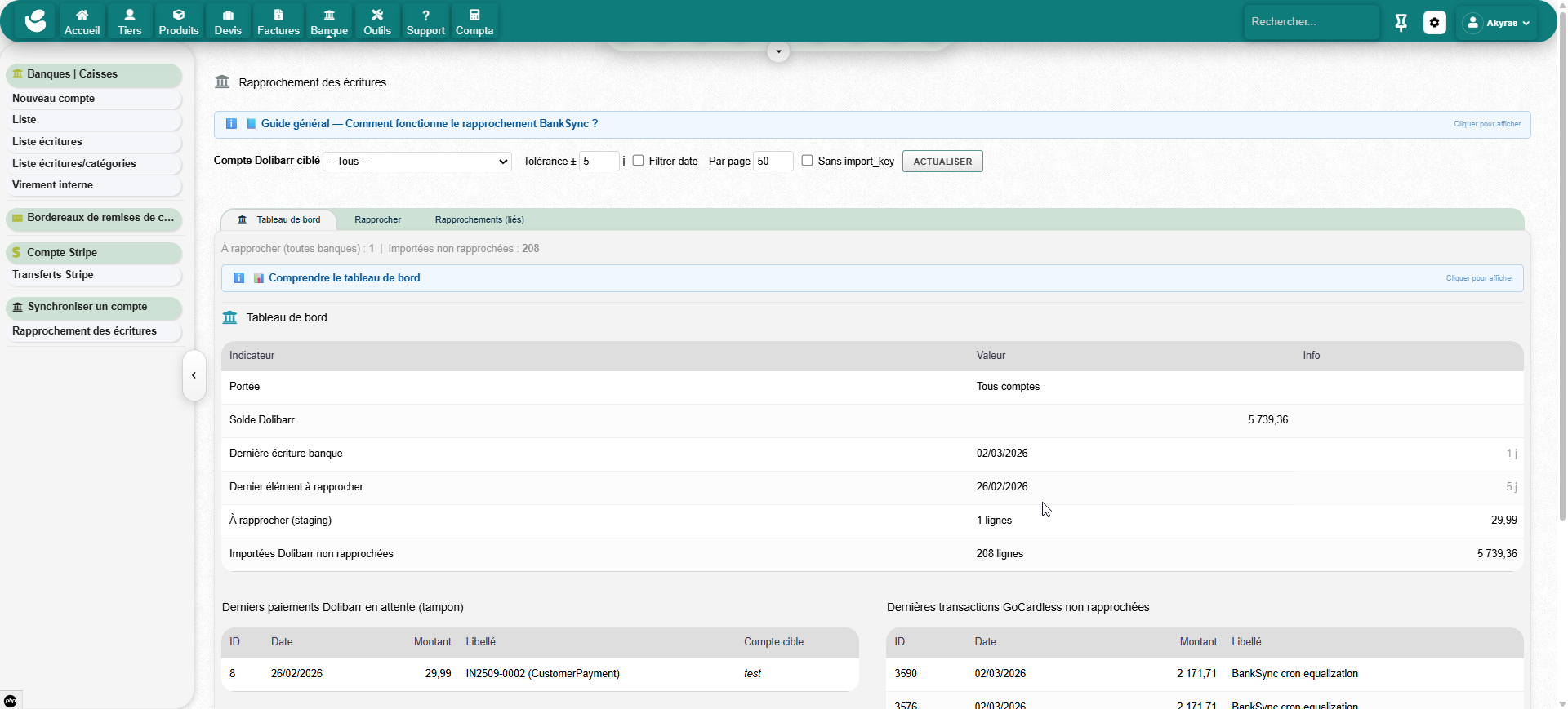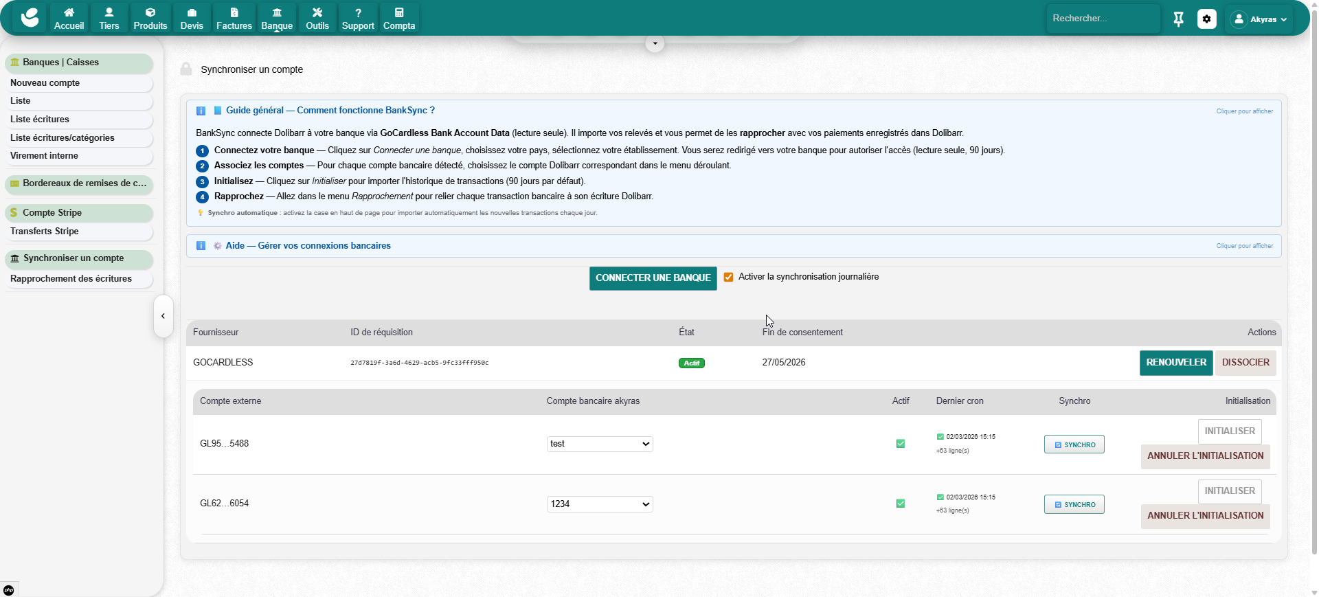 Open Banking synchronization module powered by GoCardless. Real bank transactions are automatically imported. Dolibarr payments go through a clearing account and are reconciled with real bank flows.