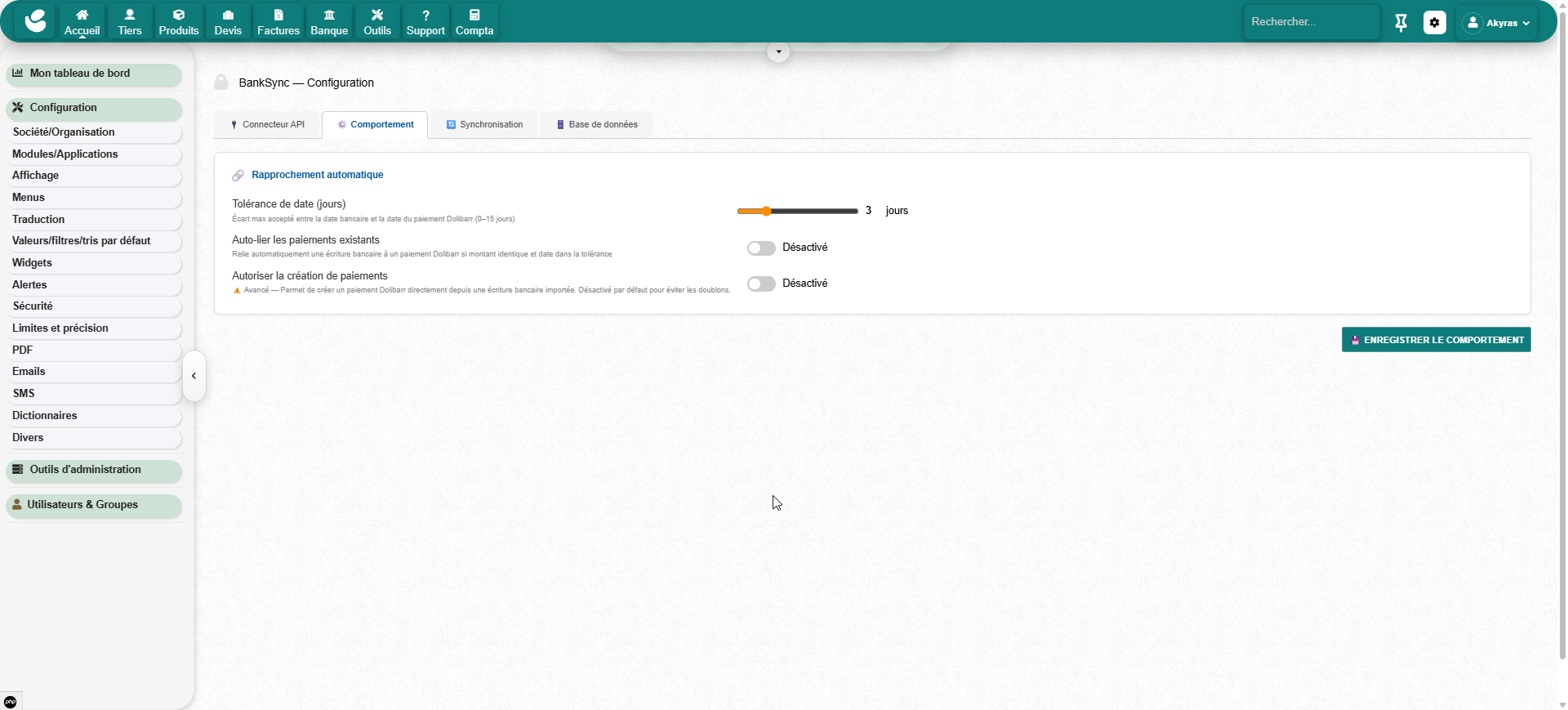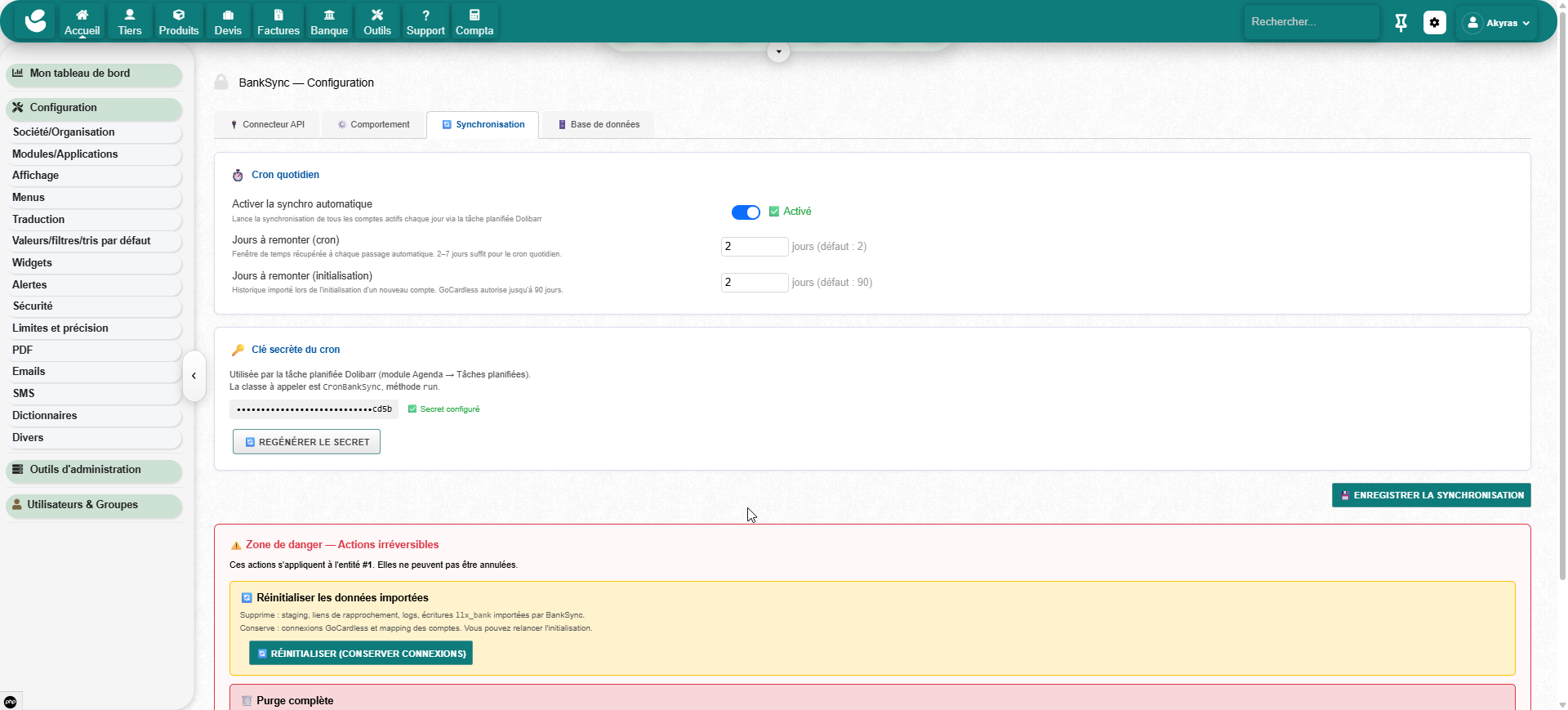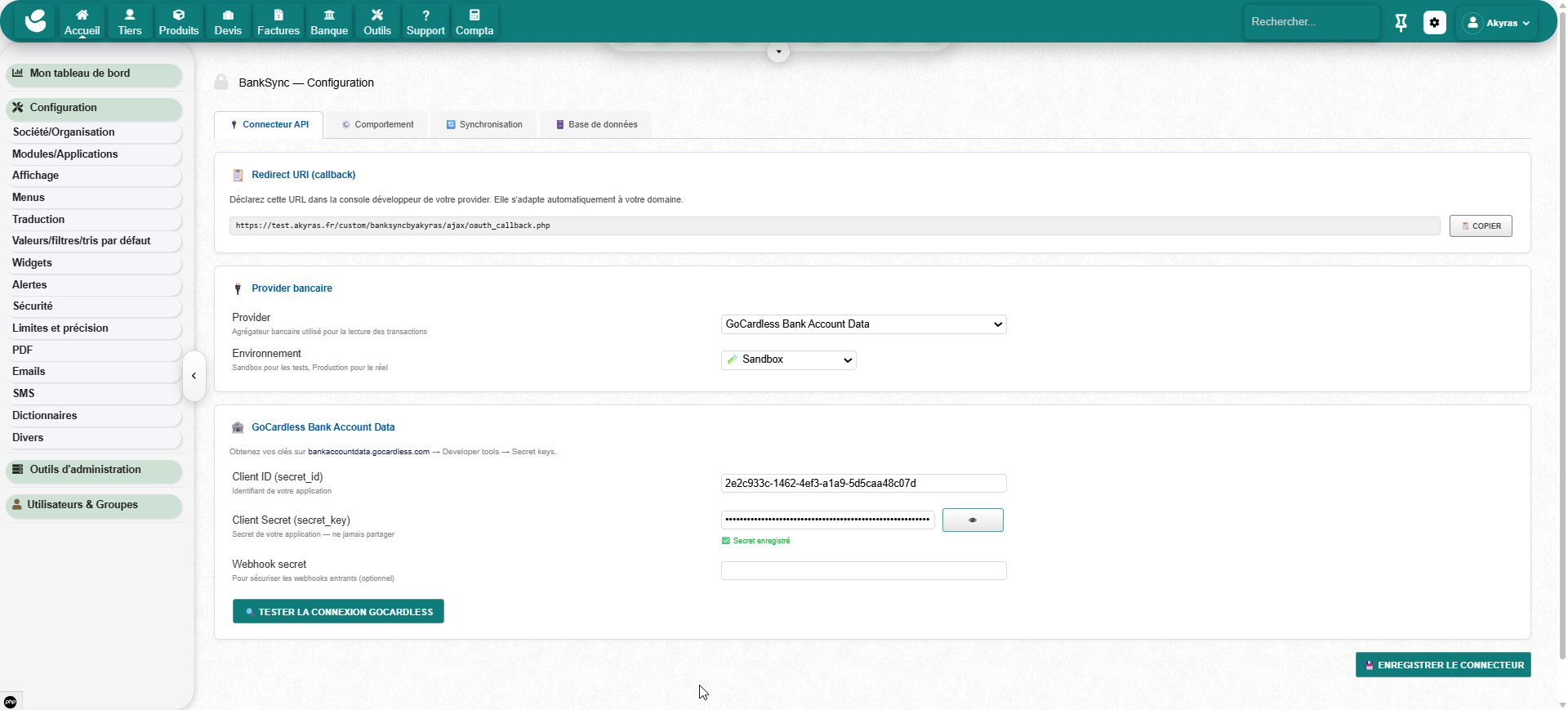 Open Banking synchronization module powered by GoCardless. Real bank transactions are automatically imported. Dolibarr payments go through a clearing account and are reconciled with real bank flows.
